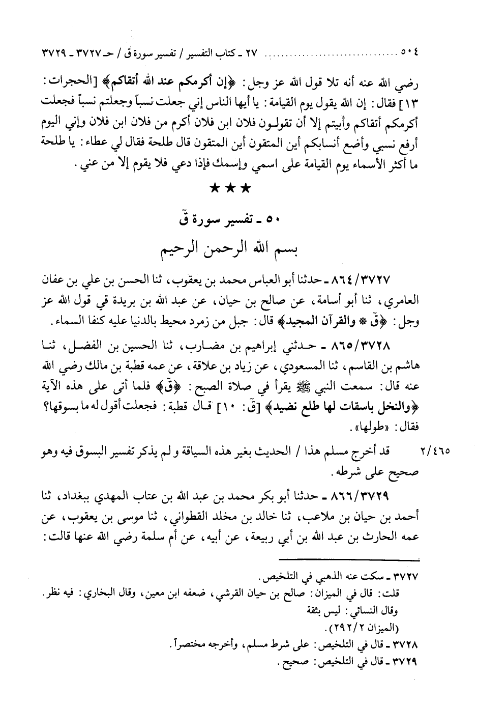 3728 - حَدَّثَنِي إِبْرَاهِيمُ بْنُ مُضَارِبٍ، ثنا الْحُسَيْنُ بْنُ الْفَضْلِ، ثنا هَاشِمُ بْنُ الْقَاسِمِ، ثنا الْمَسْعُودِيُّ، عَنْ زِيَادِ بْنِ عِلَاقَةَ، عَنْ عَمِّهِ قُطْبَةَ بْنِ مَالِكٍ رَضِيَ اللَّهُ عَنْهُ، قَالَ: سَمِعْتُ النَّبِيَّ صَلَّى اللهُ عَلَيْهِ وَسَلَّمَ «§يَقْرَأُ فِي صَلَاةِ الصُّبْحِ ق» ، فَلَمَّا أَتَى عَلَى هَذِهِ الْآيَةِ {وَالنَّخْلَ بَاسِقَاتٍ لَهَا طَلْعٌ نَضِيدٌ} [ق: 10] قَالَ قُطْبَةُ: فَجَعَلْتُ أَقُولُ لَهُ: مَا بُسُوقُهَا فَقَالَ: طُولُهَا " قَدْ أَخْرَجَ مُسْلِمٌ هَذَا الْحَدِيثَ بِغَيْرِ هَذِهِ السِّيَاقَةِ، وَلَمْ يَذْكُرْ تَفْسِيرَ الْبُسُوقَ فِيهِ وَهُوَ صَحِيحٌ عَلَى شَرْطِهِK3728 - على شرط مسلم