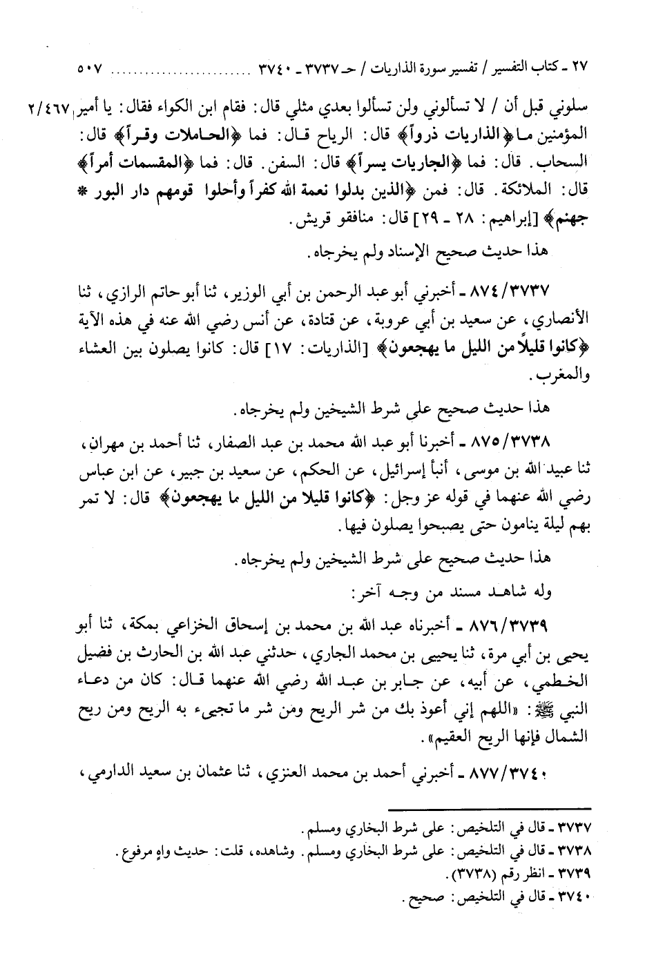 3738 - أَخْبَرَنَا أَبُو عَبْدِ اللَّهِ مُحَمَّدُ بْنُ عَبْدِ اللَّهِ الصَّفَّارُ، ثنا أَحْمَدُ بْنُ مِهْرَانَ، ثنا عُبَيْدُ اللَّهِ بْنُ مُوسَى، أَنْبَأَ إِسْرَائِيلُ، عَنِ الْحَكَمِ، عَنْ سَعِيدِ بْنِ جُبَيْرٍ، عَنِ ابْنِ عَبَّاسٍ رَضِيَ اللَّهُ عَنْهُمَا، فِي قَوْلِهِ عَزَّ وَجَلَّ: {§كَانُوا قَلِيلًا مِنَ اللَّيْلِ مَا يَهْجَعُونَ} [الذاريات: 17] قَالَ: «لَا تَمُرُّ بِهِمْ لَيْلَةٌ يَنَامُونَ حَتَّى يُصْبِحُوا يُصَلُّونَ فِيهَا» هَذَا حَدِيثٌ صَحِيحٌ عَلَى شَرْطِ الشَّيْخَيْنِ وَلَمْ يُخَرِّجَاهُ وَلَهُ شَاهِدٌ مُسْنَدٌ مِنْ وَجْهٍ آخَرَ "K3738 - على شرط البخاري ومسلم