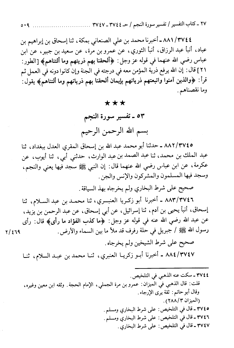 3745 - حَدَّثَنَا أَبُو مُحَمَّدٍ عَبْدُ اللَّهِ بْنُ إِسْحَاقَ الْمُقْرِئُ الْعَدْلُ بِبَغْدَادَ، ثنا عَبْدُ الْمَلِكِ بْنُ مُحَمَّدٍ، ثنا عَبْدُ الصَّمَدِ بْنُ عَبْدِ الْوَارِثِ، حَدَّثَنِي أَبِي، ثنا أَيُّوبُ، عَنْ عِكْرِمَةَ، عَنِ ابْنِ عَبَّاسٍ رَضِيَ اللَّهُ عَنْهُمَا، قَالَ: إِنَّ النَّبِيَّ صَلَّى اللهُ عَلَيْهِ وَسَلَّمَ «§سَجَدَ فِيهَا يَعْنِي وَالنَّجْمِ، وَسَجَدَ فِيهَا الْمُسْلِمُونَ وَالْمُشْرِكُونَ وَالْإِنْسُ وَالْجِنُّ» صَحِيحٌ عَلَى شَرْطِ الْبُخَارِيِّ وَلَمْ يُخَرِّجَاهُ بِهَذِهِ السِّيَاقَةِ "K3745 - على شرط البخاري ومسلم