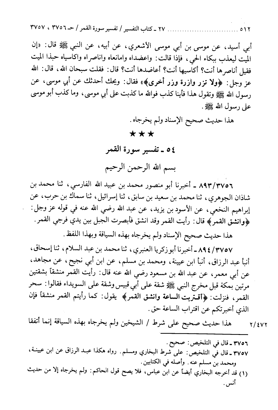 3757 - أَخْبَرَنَا أَبُو زَكَرِيَّا الْعَنْبَرِيُّ، ثنا مُحَمَّدُ بْنُ عَبْدِ السَّلَامِ، ثنا إِسْحَاقُ، أَنْبَأَ عَبْدُ الرَّزَّاقِ، أَنْبَأَ ابْنُ عُيَيْنَةَ، وَمُحَمَّدُ بْنُ مُسْلِمٍ، عَنِ ابْنِ أَبِي نَجِيحٍ، عَنْ مُجَاهِدٍ، عَنْ أَبِي مَعْمَرٍ، عَنْ عَبْدِ اللَّهِ بْنِ مَسْعُودٍ رَضِيَ اللَّهُ عَنْهُ، قَالَ: §«رَأَيْتُ الْقَمَرَ مُنْشَقًّا بِشِقَّتَيْنِ مَرَّتَيْنِ بِمَكَّةَ قَبْلَ مَخْرَجِ النَّبِيِّ صَلَّى اللهُ عَلَيْهِ وَسَلَّمَ، شِقَّةٌ عَلَى أَبِي قُبَيْسٍ، وَشِقَّةٌ عَلَى السُّوَيْدَاءِ» فَقَالُوا: سُحِرَ الْقَمَرُ، فَنَزَلَتْ {اقْتَرَبَتِ السَّاعَةُ، وَانْشَقَّ الْقَمَرُ} [القمر: 1] يَقُولُ: «كَمَا رَأَيْتُمْ مُنْشَقًّا، فَإِنَّ الَّذِي أَخْبَرْتُكُمْ عَنِ اقْتِرَابِ السَّاعَةِ حَقٌّ» هَذَا حَدِيثٌ صَحِيحٌ عَلَى شَرْطِ الشَّيْخَيْنِ وَلَمْ يُخَرِّجَاهُ بِهَذِهِ السِّيَاقَةِ «إِنَّمَا اتَّفَقَا عَلَى حَدِيثِ أَبِي مَعْمَرٍ عَنْ عَبْدِ اللَّهِ مُخْتَصَرًا وَهَذَا حَدِيثٌ لَا نَسْتَغْنِي فِيهِ عَنْ مُتَابَعَةِ الصَّحَابَةِ بَعْضٍ لِبَعْضٍ لِمُغَايَظَةِ أَهْلِ الْإِلْحَادِ، فَإِنَّهُ أَوَّلُ آيَاتِ الشَّرِيعَةِ» فَنَظَرْتُ فَإِذَا فِي الْبَابِ مِمَّا لَمْ يُخَرِّجَاهُ عَنْ عَبْدِ اللَّهِ بْنِ عَبَّاسٍ وَعَبْدِ اللَّهِ بْنِ عَمْرٍو وَجُبَيْرِ بْنِ مُطْعِمٍ رَضِيَ اللَّهُ عَنْهُمْ وَلَمْ يُخَرِّجَاهُ مِنْهَا إِلَّا حَدِيثُ أَنَسٍ «فَأَمَّا حَدِيثُ ابْنِ عَبَّاسٍ رَضِيَ اللَّهُ عَنْهُمَا» K3757 - على شرط البخاري ومسلم