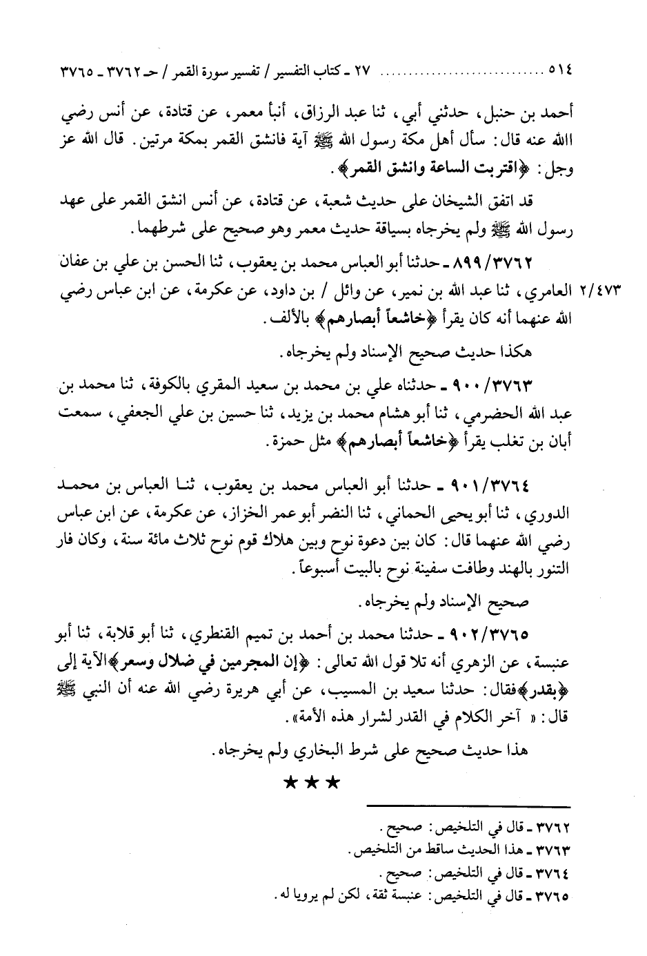 3762 - حَدَّثَنَا أَبُو الْعَبَّاسِ مُحَمَّدُ بْنُ يَعْقُوبَ، ثنا الْحَسَنُ بْنُ عَلِيِّ بْنِ عَفَّانَ الْعَامِرِيُّ، ثنا عَبْدُ اللَّهِ بْنُ نُمَيْرٍ، عَنْ وَائِلِ بْنِ دَاوُدَ، عَنْ عِكْرِمَةَ، عَنِ ابْنِ عَبَّاسٍ رَضِيَ اللَّهُ عَنْهُمَا، أَنَّهُ كَانَ يَقْرَأُ: §(خَاشِعًا أَبْصَارُهُمْ) بِالْأَلْفِ «هَذَا حَدِيثٌ صَحِيحُ الْإِسْنَادِ وَلَمْ يُخَرِّجَاهُ» K3762 - صحيح