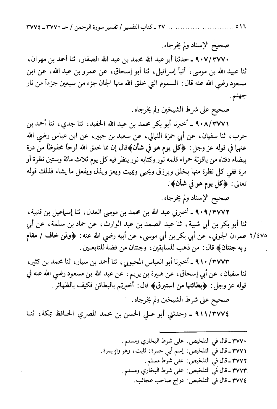 3776 - أَخْبَرَنَا أَبُو عَبْدِ اللَّهِ مُحَمَّدُ بْنُ عَبْدِ اللَّهِ الْأَصْبَهَانِيُّ الزَّاهِدُ، ثنا أُسَيْدُ بْنُ عَاصِمٍ الْأَصْبَهَانِيُّ، ثنا الْحُسَيْنُ بْنُ جَعْفَرٍ، ثنا سُفْيَانُ، عَنْ حَمَّادٍ، عَنْ سَعِيدِ بْنِ جُبَيْرٍ، عَنِ ابْنِ عَبَّاسٍ رَضِيَ اللَّهُ عَنْهُمَا، فِي قَوْلِهِ عَزَّ وَجَلَّ: {§فِيهِمَا فَاكِهَةٌ وَنَخْلٌ وَرُمَّانٌ} [الرحمن: 68] قَالَ: «نَخْلُ الْجَنَّةِ جُذُوعُهَا زُمُرُّدٌ أَخْضَرُ وَكَرَانِيفُهَا ذَهَبٌ أَحْمَرُ، وَسَعَفُهَا كِسْوَةٌ لِأَهْلِ الْجَنَّةِ مِنْهَا مُقَطَّعَاتُهُمْ وَحُلَلُهُمْ وَثَمَرُهَا أَمْثَالُ الْقِلَالِ أَوِ الدِّلَاءِ أَشَدُّ بَيَاضًا مِنَ اللَّبَنِ، وَأَحْلَى مِنَ الْعَسَلِ، وَأَلْيَنُ مِنَ الزُّبْدِ، وَلَيْسَ لَهَا عَجْمٌ» هَذَا حَدِيثٌ صَحِيحٌ عَلَى شَرْطِ مُسْلِمٍ وَلَمْ يُخَرِّجَاهُ "K3776 - على شرط مسلم