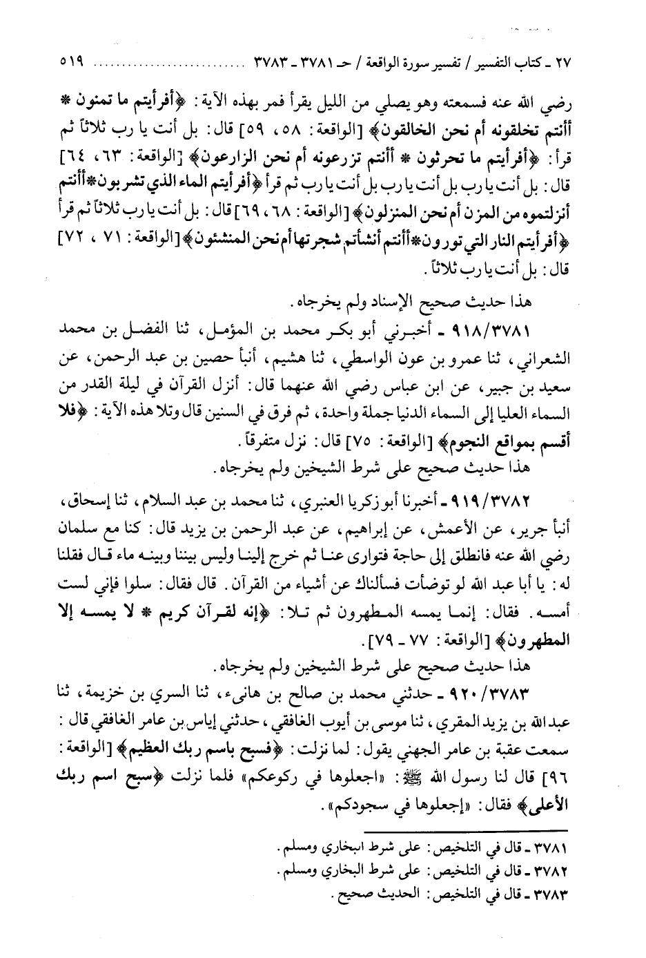 3781 - أَخْبَرَنِي أَبُو بَكْرٍ مُحَمَّدُ بْنُ الْمُؤَمَّلِ، ثنا الْفَضْلُ بْنُ مُحَمَّدٍ الشَّعْرَانِيُّ، ثنا عَمْرُو بْنُ عَوْنٍ الْوَاسِطِيُّ، ثنا هُشَيْمٌ، أَنْبَأَ حُصَيْنُ بْنُ عَبْدِ الرَّحْمَنِ، عَنْ سَعِيدِ بْنِ جُبَيْرٍ، عَنِ ابْنِ عَبَّاسٍ رَضِيَ اللَّهُ عَنْهُمَا، قَالَ: §" أُنْزِلَ الْقُرْآنُ فِي لَيْلَةِ الْقَدْرِ مِنَ السَّمَاءِ الْعُلْيَا إِلَى السَّمَاءِ الدُّنْيَا جُمْلَةً وَاحِدَةً، ثُمَّ فُرِقَ فِي السِّنِينَ قَالَ: وَتَلَا هَذِهِ الْآيَةَ {فَلَا أُقْسِمُ بِمَوَاقِعِ النُّجُومِ} [الواقعة: 75] قَالَ: «نَزَلَ مُتَفَرِّقًا» هَذَا حَدِيثٌ صَحِيحٌ عَلَى شَرْطِ الشَّيْخَيْنِ وَلَمْ يُخَرِّجَاهُ "K3781 - على شرط البخاري ومسلم