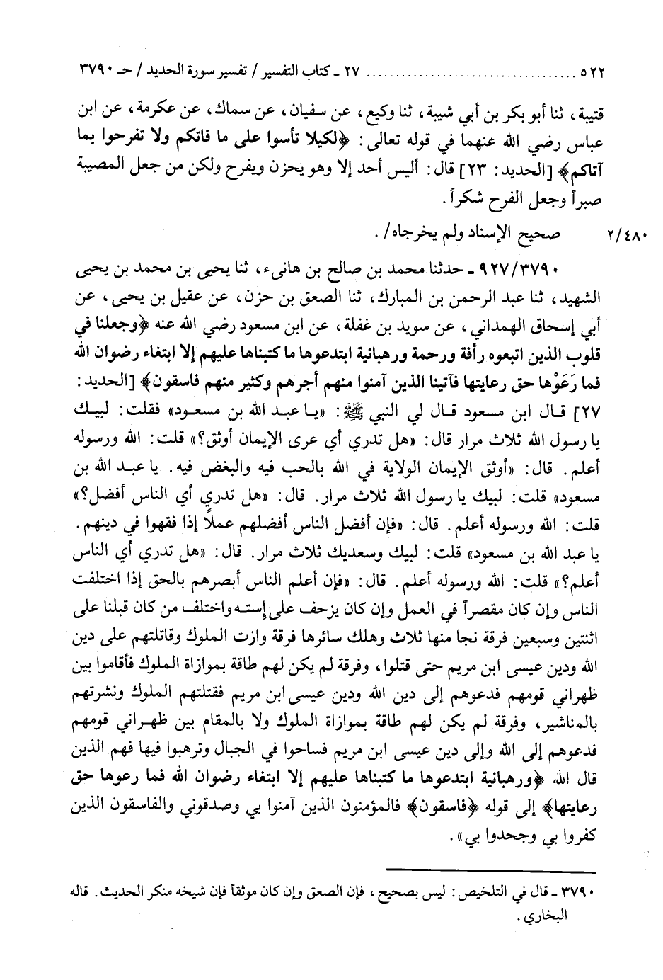 3790 - حَدَّثَنَا مُحَمَّدُ بْنُ صَالِحِ بْنِ هَانِئٍ، ثنا يَحْيَى بْنُ مُحَمَّدِ بْنِ يَحْيَى الشَّهِيدُ، ثنا عَبْدُ الرَّحْمَنِ بْنُ الْمُبَارَكِ، ثنا الصَّعْقُ بْنُ حَزْنٍ، عَنْ عَقِيلِ بْنِ يَحْيَى، عَنْ أَبِي إِسْحَاقَ الْهَمْدَانِيِّ، عَنْ سُوَيْدِ بْنِ غَفَلَةَ، عَنِ ابْنِ مَسْعُودٍ رَضِيَ اللَّهُ عَنْهُ، {وَجَعَلْنَا فِي قُلُوبِ الَّذِينَ اتَّبَعُوهُ رَأْفَةً وَرَحْمَةً وَرَهْبَانِيَّةً ابْتَدَعُوهَا مَا كَتَبْنَاهَا عَلَيْهِمْ إِلَّا ابْتِغَاءَ رِضْوَانِ اللَّهِ فَمَا رَعَوْهَا حَقَّ رِعَايَتِهَا، فَآتَيْنَا الَّذِينَ آمَنُوا مِنْهُمْ أَجْرَهُمْ وَكَثِيرٌ مِنْهُمْ فَاسِقُونَ} [الحديد: 27] قَالَ ابْنُ مَسْعُودٍ: قَالَ لِيَ النَّبِيُّ صَلَّى اللهُ عَلَيْهِ وَسَلَّمَ: «يَا عَبْدَ اللَّهِ بْنَ مَسْعُودٍ» فَقُلْتُ: لَبَّيْكَ يَا رَسُولَ اللَّهِ، ثَلَاثَ مِرَارٍ، قَالَ: «§هَلْ تَدْرِي أَيُّ عُرَى الْإِيمَانِ أَوْثَقُ؟» قُلْتُ: اللَّهُ وَرَسُولُهُ أَعْلَمُ. قَالَ: «أَوْثَقُ الْإِيمَانِ الْوَلَايَةُ فِي اللَّهِ بِالْحَبِّ فِيهِ وَالْبُغْضِ فِيهِ، يَا عَبْدَ اللَّهِ بْنَ مَسْعُودٍ» قُلْتُ: لَبَّيْكَ يَا رَسُولَ اللَّهِ، ثَلَاثَ مِرَارٍ، قَالَ: «هَلْ تَدْرِي أَيُّ النَّاسِ أَفْضَلُ؟» قُلْتُ: اللَّهُ وَرَسُولُهُ أَعْلَمُ. قَالَ: «فَإِنَّ أَفْضَلَ النَّاسِ أَفْضَلُهُمْ عَمَلًا إِذَا فَقِهُوا فِي دِينِهِمْ، يَا عَبْدَ اللَّهِ بْنَ مَسْعُودٍ» قُلْتُ: لَبَّيْكَ وَسَعْدَيْكَ، ثَلَاثَ مِرَارٍ، قَالَ: «هَلْ تَدْرِي أَيُّ النَّاسِ أَعْلَمُ؟» قُلْتُ: اللَّهُ وَرَسُولُهُ أَعْلَمُ. قَالَ: " فَإِنَّ أَعْلَمَ النَّاسِ أَبْصَرُهُمْ بِالْحَقِّ إِذَا اخْتَلَفَتِ النَّاسُ، وَإِنْ كَانَ مُقَصِّرًا فِي الْعَمَلِ وَإِنْ كَانَ يَزْحَفُ عَلَى اسْتِهِ، وَاخْتَلَفَ مَنْ كَانَ قَبْلَنَا عَلَى اثْنَتَيْنِ وَسَبْعِينَ فِرْقَةً نَجَا مِنْهَا ثَلَاثٌ، وَهَلَكَ سَائِرُهَا، فِرْقَةٌ وَازَتِ الْمُلُوكَ وَقَاتَلَتْهُمْ عَلَى دِينِ اللَّهِ وَدِينِ عِيسَى ابْنِ مَرْيَمَ حَتَّى قُتِلُوا، وَفِرْقَةٌ لَمْ يَكُنْ لَهُمْ طَاقَةٌ بِمُوَازَاةِ الْمُلُوكِ فَأَقَامُوا بَيْنَ ظَهْرَانَيْ قَوْمِهِمْ فَدَعَوْهُمْ إِلَى دِينِ اللَّهِ وَدِينِ عِيسَى ابْنِ مَرْيَمَ فَقَتَلَتْهُمُ الْمُلُوكُ، وَنَشَرَتْهُمْ بِالْمَنَاشِيرِ، وَفِرْقَةٌ لَمْ يَكُنْ لَهُمْ طَاقَةٌ بِمُوَازَاةِ الْمُلُوكِ وَلَا بِالْمُقَامِ بَيْنَ ظَهْرَانَيْ قَوْمِهِمْ فَدَعَوْهُمْ إِلَى اللَّهِ وَإِلَى دِينِ عِيسَى ابْنِ مَرْيَمَ فَسَاحُوا فِي الْجِبَالِ وَتَرَهَّبُوا فِيهَا فَهُمُ الَّذِينَ قَالَ اللَّهُ {وَرَهْبَانِيَّةً ابْتَدَعُوهَا مَا كَتَبْنَاهَا عَلَيْهِمْ إِلَّا ابْتِغَاءَ رِضْوَانِ اللَّهِ فَمَا رَعَوْهَا حَقَّ رِعَايَتِهَا} [الحديد: 27] إِلَى قَوْلِهِ {فَاسِقُونَ} [الحديد: 27] فَالْمُؤْمِنُونَ الَّذِينَ آمَنُوا بِي وَصَدَّقُونِي وَالْفَاسِقُونَ الَّذِينَ كَفَرُوا بِي وَجَحَدُوا بِي «هَذَا حَدِيثٌ صَحِيحُ الْإِسْنَادِ وَلَمْ يُخَرِّجَاهُ» K3790 - ليس بصحيح
