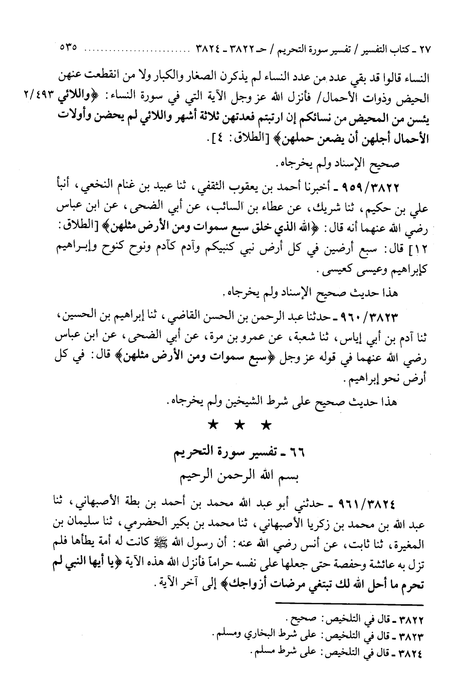 3823 - حَدَّثَنَا عَبْدُ الرَّحْمَنِ بْنُ الْحَسَنِ الْقَاضِي، ثنا إِبْرَاهِيمُ بْنُ الْحُسَيْنِ، ثنا آدَمُ بْنُ أَبِي إِيَاسٍ، ثنا شُعْبَةُ، عَنْ عَمْرِو بْنِ مُرَّةَ، عَنْ أَبِي الضُّحَى، عَنِ ابْنِ عَبَّاسٍ رَضِيَ اللَّهُ عَنْهُمَا، فِي قَوْلِهِ عَزَّ وَجَلَّ: " {§سَبْعَ سَمَاوَاتٍ وَمِنَ الْأَرْضِ مِثْلَهُنَّ} [الطلاق: 12] قَالَ: فِي كُلِّ أَرْضٍ نَحْوُ إِبْرَاهِيمَ «هَذَا حَدِيثٌ صَحِيحٌ عَلَى شَرْطِ الشَّيْخَيْنِ وَلَمْ يُخَرِّجَاهُ» K3823 - على شرط البخاري ومسلم