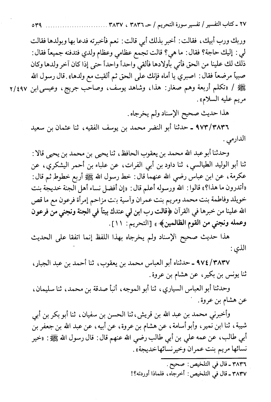 3837 - حَدَّثَنَاهُ أَبُو الْعَبَّاسِ مُحَمَّدُ بْنُ يَعْقُوبَ، ثنا أَحْمَدُ بْنُ عَبْدِ الْجَبَّارِ، ثنا يُونُسُ بْنُ بُكَيْرٍ، عَنْ هِشَامِ بْنِ عُرْوَةَ، وَثَنَا أَبُو الْعَبَّاسِ السَّيَّارِيُّ، ثنا أَبُو الْمُوَجِّهِ، أَنْبَأَ صَدَقَةُ بْنُ مُحَمَّدٍ، ثنا سُلَيْمَانُ، عَنْ هِشَامِ بْنِ عُرْوَةَ، وَأَخْبَرَنِي مُحَمَّدُ بْنُ عَبْدِ اللَّهِ بْنِ قُرَيْشٍ، ثنا الْحَسَنُ بْنُ سُفْيَانَ، ثنا أَبُو بَكْرِ بْنُ أَبِي شَيْبَةَ، ثنا ابْنُ نُمَيْرٍ، وَأَبُو أُسَامَةَ، عَنْ هِشَامِ بْنِ عُرْوَةَ، عَنْ أَبِيهِ، عَنْ عَبْدِ اللَّهِ بْنِ جَعْفَرِ بْنِ أَبِي طَالِبٍ، عَنْ عَمِّهِ عَلِيِّ بْنِ أَبِي طَالِبٍ رَضِيَ اللَّهُ عَنْهُمْ، قَالَ: قَالَ رَسُولُ اللَّهِ صَلَّى اللهُ عَلَيْهِ وَسَلَّمَ: «§خَيْرُ نِسَائِهَا مَرْيَمُ بِنْتُ عِمْرَانَ، وَخَيْرُ نِسَائِهَا خَدِيجَةُ» رَوَاهُ الْبُخَارِيُّ فِي الصَّحِيحِ عَنْ صَدَقَةَ بْنِ مُحَمَّدٍ، وَرَوَاهُ مُسْلِمٌ عَنْ أَبِي خَيْثَمَةَ وَأَبِي بَكْرِ بْنِ أَبِي شَيْبَةَ بِهَذِهِ السِّيَاقَةِK3837 - أخرجاه فلماذا أوردته