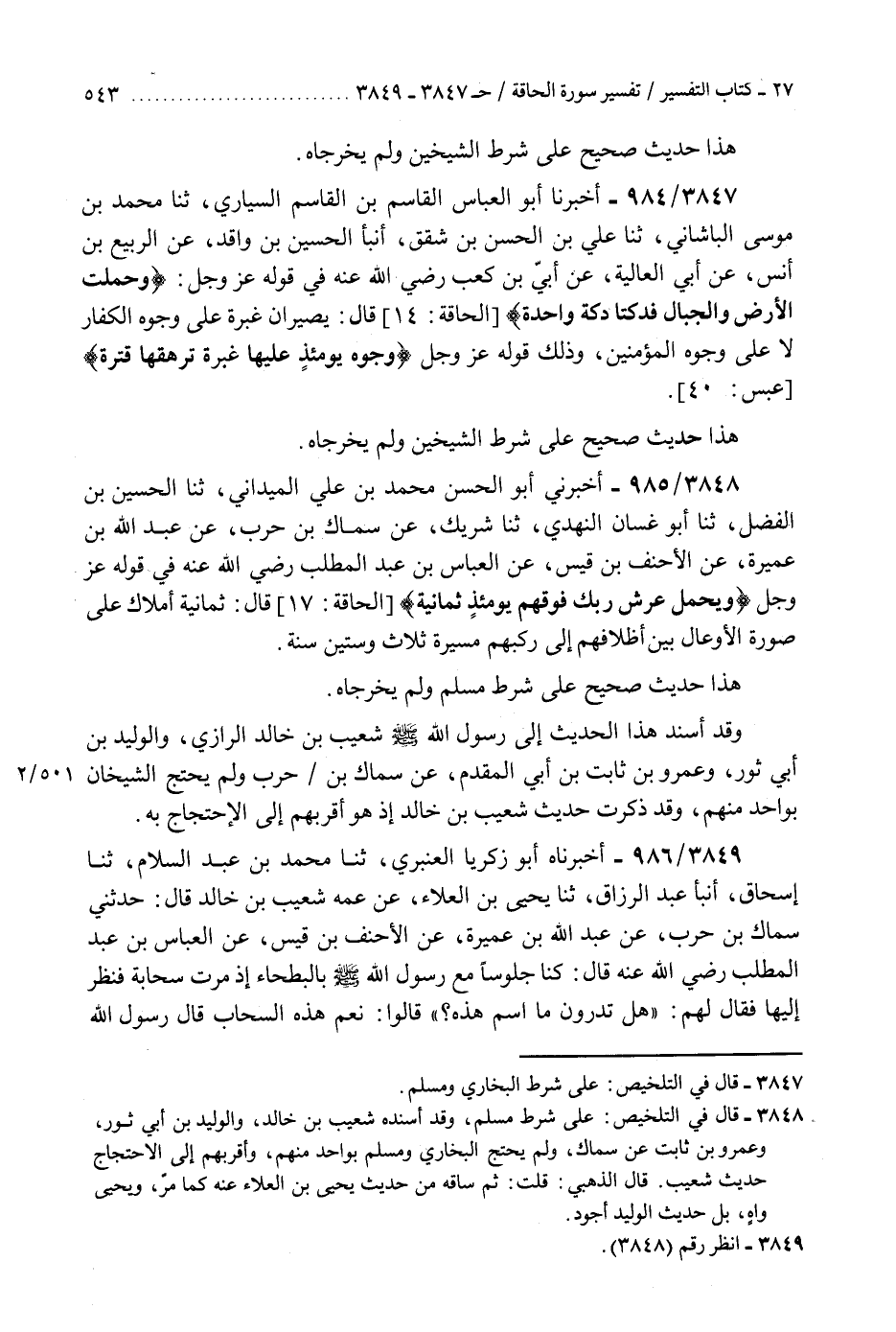 3848 - أَخْبَرَنِي أَبُو الْحُسَيْنِ مُحَمَّدُ بْنُ عَلِيٍّ الْمَيْدَانِيُّ، ثنا الْحُسَيْنُ بْنُ الْفَضْلِ، ثنا أَبُو غَسَّانَ النَّهْدِيُّ، ثنا شَرِيكٌ، عَنْ سِمَاكِ بْنِ حَرْبٍ، عَنْ عَبْدِ اللَّهِ بْنِ عَمِيرَةَ، عَنِ الْأَحْنَفِ بْنِ قَيْسٍ، عَنِ الْعَبَّاسِ بْنِ عَبْدِ الْمُطَّلِبِ رَضِيَ اللَّهُ عَنْهُ، فِي قَوْلِهِ عَزَّ وَجَلَّ: {§وَيَحْمِلُ عَرْشَ رَبِّكَ فَوْقَهُمْ يَوْمَئِذٍ ثَمَانِيَةٌ} [الحاقة: 17] قَالَ: «ثَمَانِيَةُ أَمْلَاكٍ عَلَى صُورَةِ الْأَوْعَالِ بَيْنَ أَظْلَافِهِمْ إِلَى رُكَبِهِمْ مَسِيرَةُ ثَلَاثٍ وَسِتِّينَ سَنَةً» هَذَا حَدِيثٌ صَحِيحٌ عَلَى شَرْطِ مُسْلِمٍ وَلَمْ يُخَرِّجَاهُ " وَقَدْ أَسْنَدَ هَذَا الْحَدِيثَ إِلَى رَسُولِ اللَّهِ صَلَّى اللهُ عَلَيْهِ وَسَلَّمَ شُعَيْبُ بْنُ خَالِدٍ الرَّازِيُّ، وَالْوَلِيدُ بْنُ أَبِي ثَوْرٍ، وَعَمْرُو بْنُ ثَابِتِ بْنِ أَبِي الْمُقَدَّمِ، عَنْ سِمَاكِ بْنِ حَرْبٍ وَلَمْ يُحْتَجَّ الشَّيْخَانِ بِوَاحِدٍ مِنْهُمْ. وَقَدْ ذَكَرْتُ حَدِيثَ شُعَيْبِ بْنِ خَالِدٍ إِذْ هُوَ أَقْرَبُهُمْ إِلَى الِاحْتِجَاجِ بِهِK3848 - على شرط مسلم