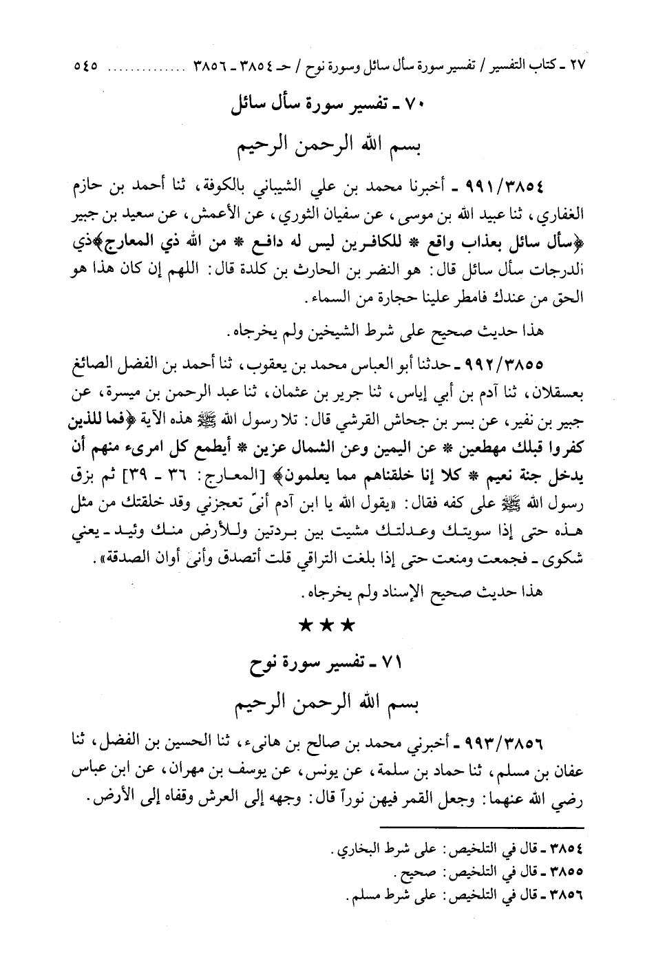 3854 - أَخْبَرَنَا مُحَمَّدُ بْنُ عَلِيٍّ الشَّيْبَانِيُّ بِالْكُوفَةَ، ثنا أَحْمَدُ بْنُ حَازِمٍ الْغِفَارِيُّ، ثنا عُبَيْدُ اللَّهِ بْنُ مُوسَى، عَنْ سُفْيَانَ الثَّوْرِيِّ، عَنِ الْأَعْمَشِ، عَنْ سَعِيدِ بْنِ جُبَيْرٍ، {§سَأَلَ سَائِلٌ بِعَذَابٍ وَاقِعٍ لِلْكَافِرِينَ لَيْسَ لَهُ دَافِعٌ مِنَ اللَّهِ ذِي الْمَعَارِجِ} [المعارج: 2] ذِي الدَّرَجَاتِ {سَأَلَ سَائِلٌ} [المعارج: 1] قَالَ: هُوَ النَّضْرُ بْنُ الْحَارِثِ بْنِ كَلَدَةَ قَالَ: «اللَّهُمَّ إِنْ كَانَ هَذَا هُوَ الْحَقَّ مِنْ عِنْدِكَ، فَأَمْطِرْ عَلَيْنَا حِجَارَةً مِنَ السَّمَاءِ» هَذَا حَدِيثٌ صَحِيحٌ عَلَى شَرْطِ الشَّيْخَيْنِ وَلَمْ يُخَرِّجَاهُ "K3854 - على شرط البخاري