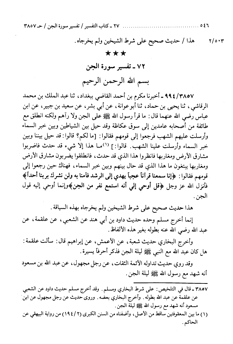 3857 - أَخْبَرَنَا مُكْرَمُ بْنُ أَحْمَدَ الْقَاضِي، بِبَغْدَادَ، ثنا عَبْدُ الْمَلِكِ بْنُ مُحَمَّدٍ الرَّقَاشِيُّ، ثنا يَحْيَى بْنُ حَمَّادٍ، ثنا أَبُو عَوَانَةَ، عَنْ أَبِي بِشْرٍ، عَنْ سَعِيدِ بْنِ جُبَيْرٍ، عَنِ ابْنِ عَبَّاسٍ رَضِيَ اللَّهُ عَنْهُمَا، قَالَ: §" مَا قَرَأَ رَسُولُ اللَّهِ صَلَّى اللهُ عَلَيْهِ وَسَلَّمَ عَلَى الْجِنِّ وَلَا رَآهُمْ وَلَكِنَّهُ انْطَلَقَ مَعَ طَائِفَةٍ مِنْ أَصْحَابِهِ عَامِدِينَ إِلَى سُوقِ عُكَاظَ، وَقَدْ حِيلَ بَيْنَ الشَّيَاطِينِ وَبَيْنَ خَبَرِ السَّمَاءِ وَأُرْسِلَتْ عَلَيْهِمُ الشُّهُبُ فَرَجَعُوا إِلَى قَوْمِهِمْ، فَقَالُوا: مَا لَكُمْ؟ قَالُوا: قَدْ حِيلَ بَيْنَنَا وَبَيْنَ خَبَرِ السَّمَاءِ وَأُرْسِلَتْ عَلَيْنَا الشُّهُبُ، قَالُوا: مَا هَذَا إِلَّا شَيْءٌ قَدْ حَدَثَ فَاضْرِبُوا مَشَارِقَ الْأَرْضِ وَمَغَارِبَهَا فَانْظُرُوا هَذَا الَّذِي قَدْ حَدَثَ، فَانْطَلَقُوا يَضْرِبُونَ مَشَارِقَ الْأَرْضِ وَمَغَارِبَهَا يَبْتَغُونَ مَا هَذَا الَّذِي قَدْ حَالَ بَيْنَهُمْ وَبَيْنَ خَبَرِ السَّمَاءِ فَهُنَاكَ حِينَ رَجَعُوا إِلَى قَوْمِهِمْ، فَقَالُوا: {إِنَّا سَمِعْنَا قُرْآنًا عَجَبًا يَهْدِي إِلَى الرُّشْدِ} [الجن: 2] فَآمَنَّا بِهِ وَلَنْ نُشْرِكَ بِرَبِّنَا أَحَدًا فَأَنْزَلَ اللَّهُ عَزَّ وَجَلَّ قُلْ أُوحِيَ إِلَيَّ أَنَّهُ اسْتَمَعَ نَفَرٌ مِنَ الْجِنِّ وَإِنَّمَا أُوحِيَ إِلَيْهِ قَوْلُ الْجِنِّ «هَذَا حَدِيثٌ صَحِيحٌ عَلَى شَرْطِ الشَّيْخَيْنِ وَلَمْ يُخَرِّجَاهُ بِهَذِهِ السِّيَاقَةِ» إِنَّمَا أَخْرَجَ مُسْلِمٌ وَحْدَهُ حَدِيثَ دَاوُدَ بْنِ أَبِي هِنْدٍ عَنِ الشَّعْبِيِّ، عَنْ عَلْقَمَةَ، عَنْ عَبْدِ اللَّهِ رَضِيَ اللَّهُ عَنْهُ، بِطُولِهِ بِغَيْرِ هَذِهِ الْأَلْفَاظِ، وَأَخْرَجَ الْبُخَارِيُّ حَدِيثَ شُعْبَةَ، عَنِ الْأَعْمَشِ، عَنْ إِبْرَاهِيمَ قَالَ: سَأَلْتُ عَلْقَمَةَ هَلْ كَانَ عَبْدُ اللَّهِ مَعَ النَّبِيِّ صَلَّى اللهُ عَلَيْهِ وَسَلَّمَ لَيْلَةَ الْجِنِّ، فَذَكَرَ أَحْرُفًا يَسِيرَةً " وَقَدْ رُوِيَ حَدِيثٌ تَدَاوَلَهُ الْأَئِمَّةُ الثِّقَاتُ عَنْ رَجُلٍ مَجْهُولٍ، عَنْ عَبْدِ اللَّهِ بْنِ مَسْعُودٍ أَنَّهُ شَهِدَ مَعَ رَسُولِ اللَّهِ صَلَّى اللهُ عَلَيْهِ وَسَلَّمَ لَيْلَةَ الْجِنِّK3857 - على شرط البخاري ومسلم