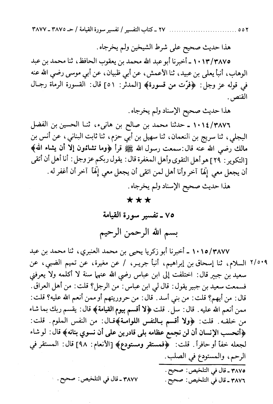 3877 - أَخْبَرَنَا أَبُو زَكَرِيَّا يَحْيَى بْنُ مُحَمَّدٍ الْعَنْبَرِيُّ، ثنا مُحَمَّدُ بْنُ عَبْدِ السَّلَامِ، ثنا إِسْحَاقُ بْنُ إِبْرَاهِيمَ، أَنْبَأَ جَرِيرٌ، عَنْ مُغِيرَةَ، عَنْ تَمِيمٍ الضَّبِّيِّ، عَنْ سَعِيدِ بْنِ جُبَيْرٍ، قَالَ: اخْتَلَفْتُ إِلَى ابْنِ عَبَّاسٍ رَضِيَ اللَّهُ عَنْهُمَا، سَنَةً لَا أُكَلِّمُهُ، وَلَا يَعْرِفُنِي فَسَمِعْتُ سَعِيدَ بْنَ جُبَيْرٍ يَقُولُ: قَالَ لِي ابْنُ عَبَّاسٍ: «مَنِ الرَّجُلُ؟» قُلْتُ: مِنْ أَهْلِ الْعِرَاقِ. قَالَ: «مِنْ أَيِّهِمْ؟» قُلْتُ: مِنْ بَنِي أَسَدٍ، قَالَ: «مِنْ حَرُورِيَّتِهِمْ أَوْ مِمَّنْ أَنْعَمَ اللَّهُ عَلَيْهِ؟» قُلْتُ: مِمَّنْ أَنْعَمَ اللَّهُ عَلَيْهِ، قَالَ: سَلْ، قُلْتُ: " {§لَا أُقْسِمُ بِيَوْمِ الْقِيَامَةِ} [القيامة: 1] " قَالَ: يُقْسِمُ رَبُّكَ بِمَا شَاءَ مِنْ خَلْقِهِ، قُلْتُ: " {وَلَا أُقْسِمُ بِالنَّفْسِ اللَّوَّامَةِ} [القيامة: 2] " قَالَ: مِنَ النَّفْسِ الْمَلُومِ. قُلْتُ: " {أَيَحْسَبُ الْإِنْسَانُ أَلَّنْ نَجْمَعَ عِظَامَهُ بَلَى قَادِرِينَ عَلَى أَنْ نُسَوِّيَ بَنَانَهُ} [القيامة: 4] " قَالَ: لَوْ شَاءَ لَجَعَلَهُ خُفًّا أَوْ حَافِرًا، قُلْتُ: " {فَمُسْتَقَرٌّ وَمُسْتَوْدَعٌ} [الأنعام: 98] " قَالَ: الْمُسْتَقَرُّ فِي الرَّحِمِ وَالْمُسْتَوْدَعُ فِي الصُّلْبِ «هَذَا حَدِيثٌ صَحِيحُ الْإِسْنَادِ وَلَمْ يُخَرِّجَاهُ» K3877 - صحيح