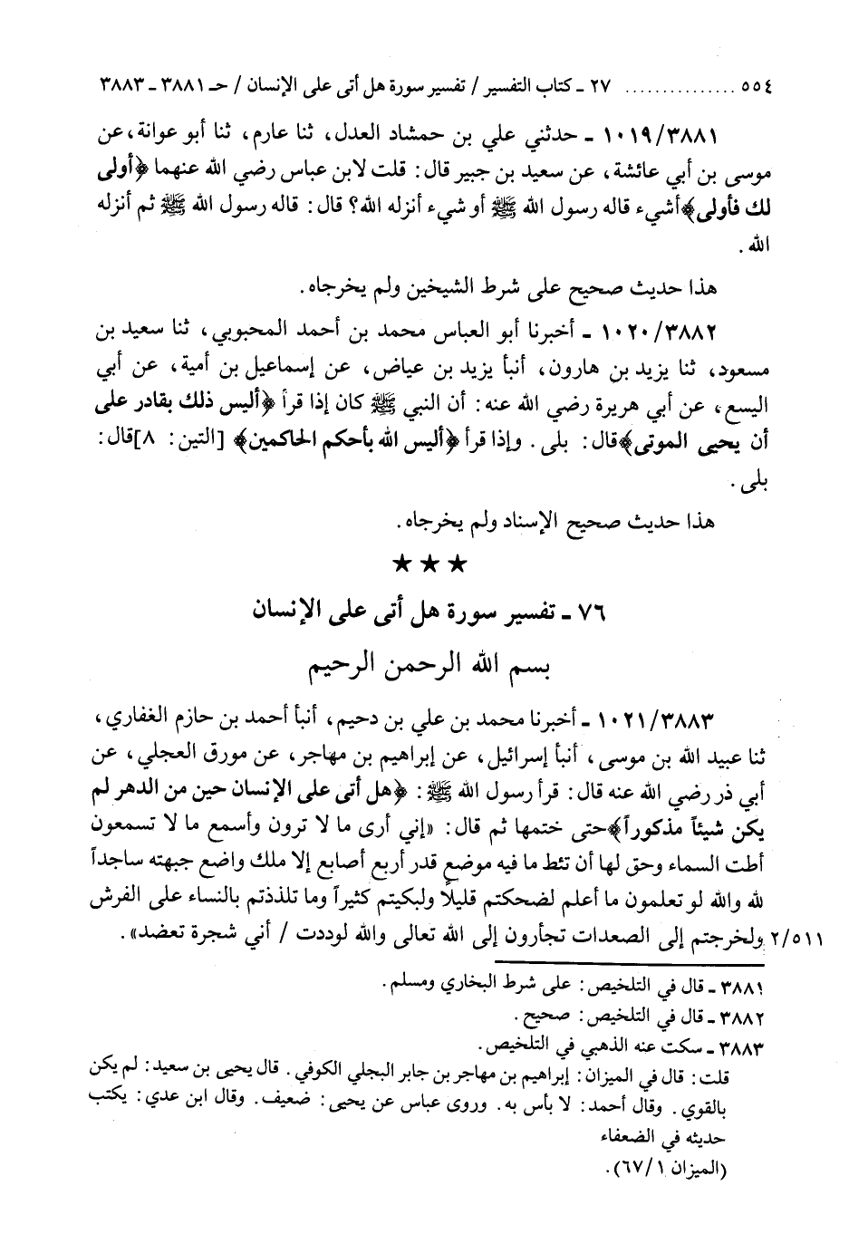 3881 - حَدَّثَنِي عَلِيُّ بْنُ حَمْشَاذَ الْعَدْلُ، ثنا عَارِمٌ، ثنا أَبُو عَوَانَةَ، عَنْ مُوسَى بْنِ أَبِي عَائِشَةَ، عَنْ سَعِيدِ بْنِ جُبَيْرٍ، قَالَ: قُلْتُ لِابْنِ عَبَّاسٍ رَضِيَ اللَّهُ عَنْهُمَا: " {§أَوْلَى لَكَ فَأَوْلَى} [القيامة: 34] " أَشَيْءٌ قَالَهُ رَسُولُ اللَّهِ صَلَّى اللهُ عَلَيْهِ وَسَلَّمَ أَوْ شَيْءٌ أَنْزَلَهُ اللَّهُ؟ قَالَ: «قَالَهُ رَسُولُ اللَّهِ صَلَّى اللهُ عَلَيْهِ وَسَلَّمَ، ثُمَّ أَنْزَلَهُ اللَّهُ» هَذَا حَدِيثٌ صَحِيحٌ عَلَى شَرْطِ الشَّيْخَيْنِ وَلَمْ يُخَرِّجَاهُ "K3881 - على شرط البخاري ومسلم