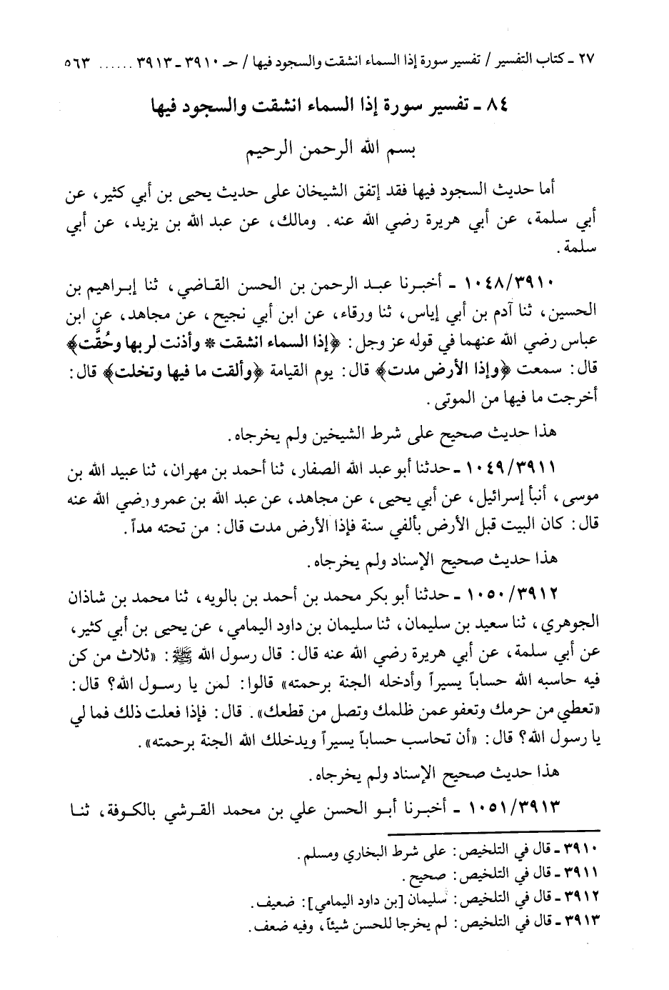 §تَفْسِيرُ سُورَةِ إِذَا السَّمَاءُ انْشَقَّتْ وَالسُّجُودِ فِيهَا بِسْمِ اللَّهِ الرَّحْمَنِ الرَّحِيمِ أَمَّا حَدِيثُ السُّجُودِ فِيهَا فَقَدِ اتَّفَقَ الشَّيْخَانِ عَلَى حَدِيثِ يَحْيَى بْنِ أَبِي كَثِيرٍ، عَنْ أَبِي سَلَمَةَ، عَنْ أَبِي هُرَيْرَةَ رَضِيَ اللَّهُ عَنْهُ، وَمَالِكٍ، عَنْ عَبْدِ اللَّهِ بْنِ يَزِيدَ عَنْ أَبِي سَلَمَةَ