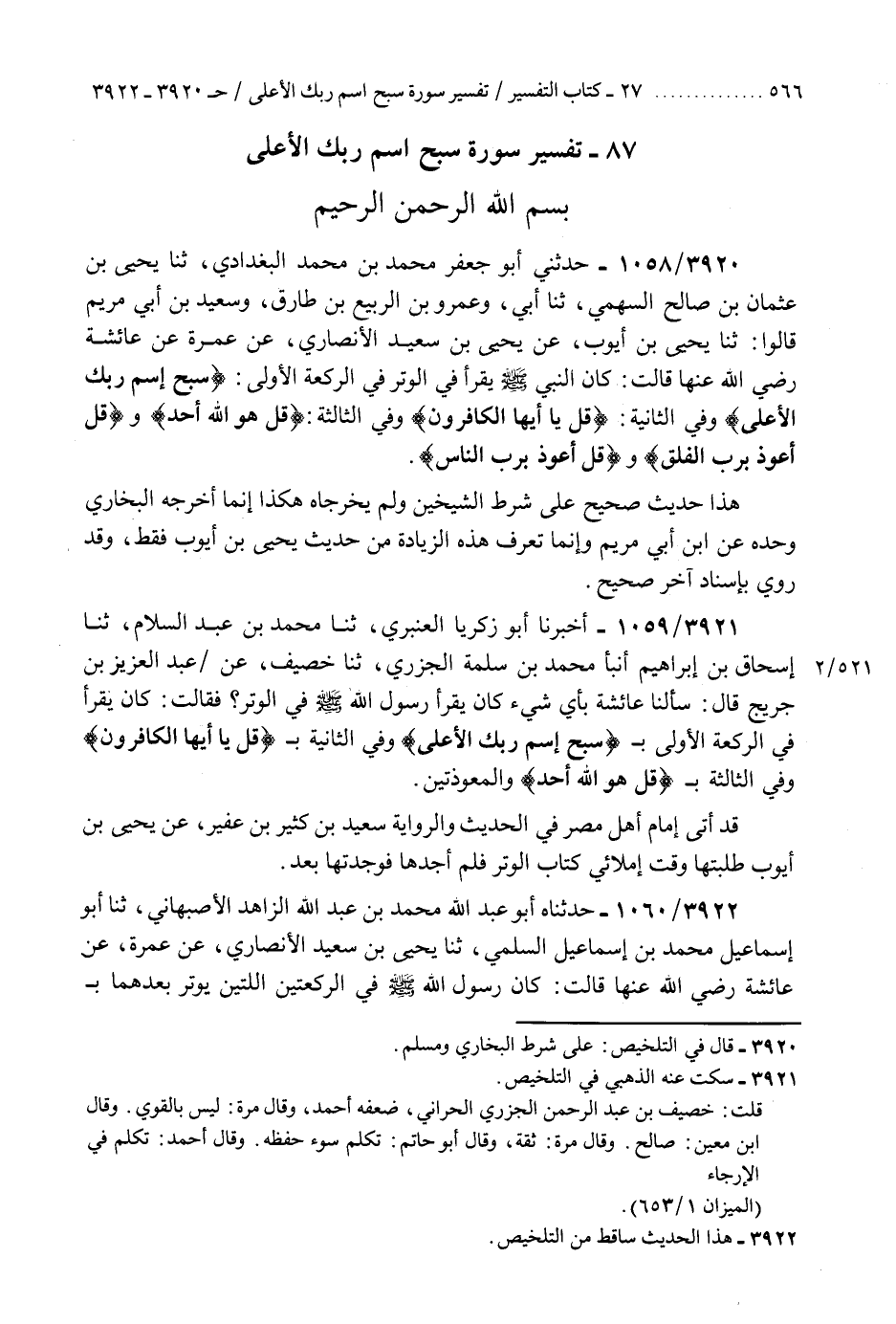 3920 - حَدَّثَنِي أَبُو جَعْفَرٍ مُحَمَّدُ بْنُ مُحَمَّدٍ الْبَغْدَادِيُّ، ثنا يَحْيَى بْنُ عُثْمَانَ بْنِ صَالِحٍ السَّهْمِيُّ، ثنا أَبِي وَعَمْرُو بْنُ الرَّبِيعِ بْنِ طَارِقٍ، وَسَعِيدُ بْنُ أَبِي مَرْيَمَ، قَالُوا: ثنا يَحْيَى بْنُ أَيُّوبَ، عَنْ يَحْيَى بْنِ سَعِيدٍ الْأَنْصَارِيِّ، عَنْ عَمْرَةَ، عَنْ عَائِشَةَ رَضِيَ اللَّهُ عَنْهَا، قَالَتْ: كَانَ النَّبِيُّ صَلَّى اللهُ عَلَيْهِ وَسَلَّمَ " §يَقْرَأُ فِي الْوِتْرِ فِي الرَّكْعَةِ الْأُولَى: سَبِّحِ اسْمَ رَبِّكَ الْأَعْلَى، وَفِي الثَّانِيَةِ: قُلْ يَا أَيُّهَا الْكَافِرُونَ، وَفِي الثَّالِثَةِ قُلْ هُوَ اللَّهُ أَحَدٌ وَقُلْ أَعُوذُ بِرَبِّ الْفَلَقِ وَقُلْ أَعُوذُ بِرَبِّ النَّاسِ «هَذَا حَدِيثٌ صَحِيحٌ عَلَى شَرْطِ الشَّيْخَيْنِ وَلَمْ يُخَرِّجَاهُ» هَكَذَا إِنَّمَا أَخْرَجَهُ الْبُخَارِيُّ وَحْدَهُ عَنِ ابْنِ أَبِي مَرْيَمَ وَإِنَّمَا تُعْرَفُ هَذِهِ الزِّيَادَةُ مِنْ حَدِيثِ يَحْيَى بْنِ أَيُّوبَ فَقَطْ وَقَدْ رُوِيَ بِإِسْنَادٍ آخَرَ صَحِيحٍK3920 - على شرط البخاري ومسلم