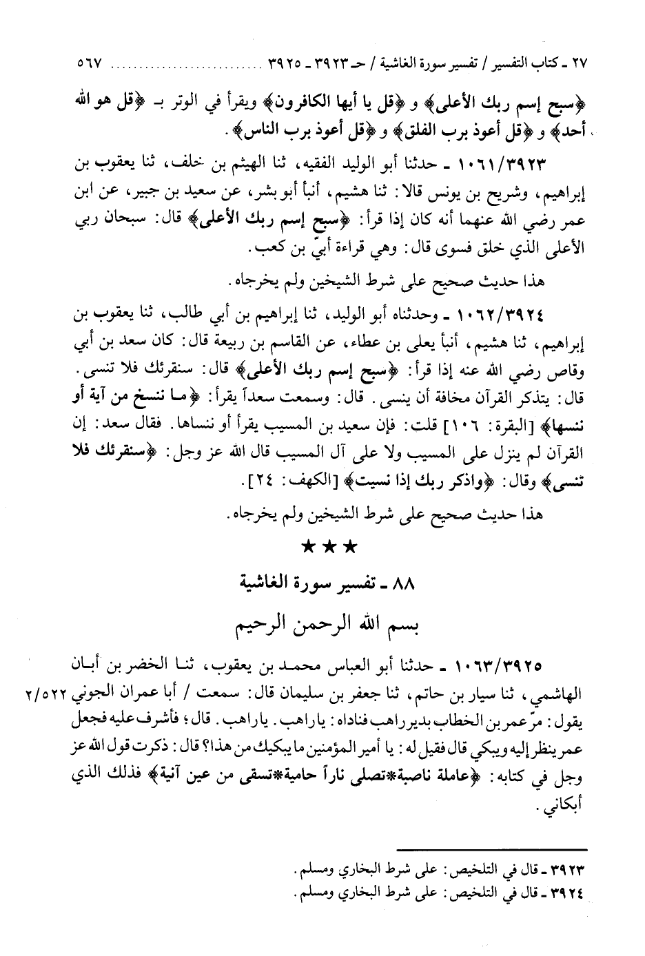 3923 - حَدَّثَنَا أَبُو الْوَلِيدِ الْفَقِيهُ، ثنا الْهَيْثَمُ بْنُ خَلَفٍ، ثنا يَعْقُوبُ بْنُ إِبْرَاهِيمَ، وَشُرَيْحُ بْنُ يُونُسَ، قَالَا: ثنا هُشَيْمٌ، أَنْبَأَ أَبُو بِشْرٍ، عَنْ سَعِيدِ بْنِ جُبَيْرٍ، عَنِ ابْنِ عُمَرَ رَضِيَ اللَّهُ عَنْهُمَا، أَنَّهُ كَانَ §إِذَا قَرَأَ {سَبِّحِ اسْمَ رَبِّكَ الْأَعْلَى} [الأعلى: 1] قَالَ: «سُبْحَانَ رَبِّيَ الْأَعْلَى الَّذِي خَلَقَ فَسَوَّى» قَالَ: وَهِيَ قِرَاءَةُ أُبَيِّ بْنِ كَعْبٍ «هَذَا حَدِيثٌ صَحِيحٌ عَلَى شَرْطِ الشَّيْخَيْنِ وَلَمْ يُخَرِّجَاهُ» K3923 - على شرط البخاري ومسلم