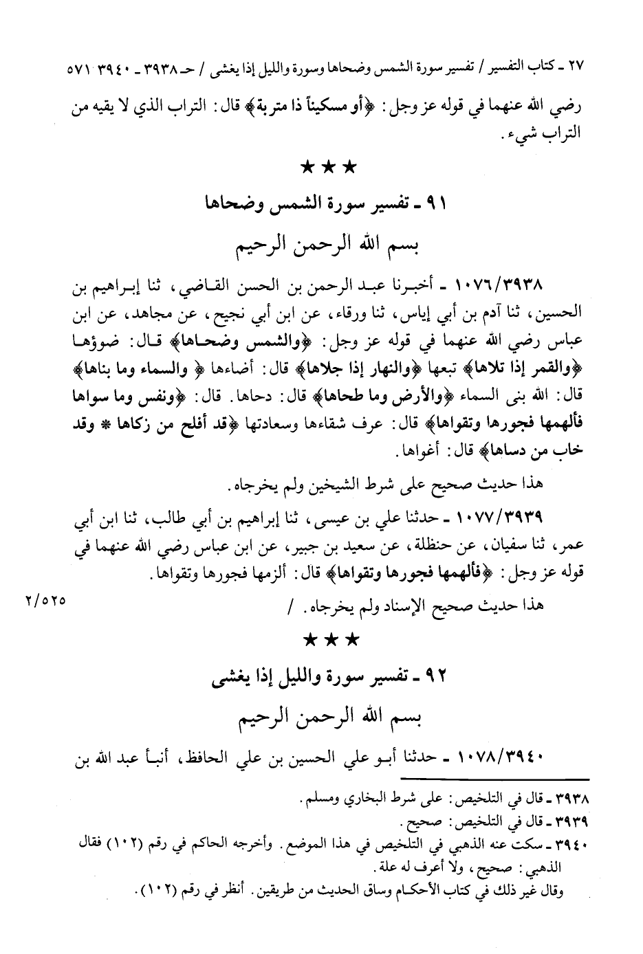 3938 - أَخْبَرَنَا عَبْدُ الرَّحْمَنِ بْنُ الْحَسَنِ الْقَاضِي، ثنا إِبْرَاهِيمُ بْنُ الْحُسَيْنِ، ثنا آدَمُ بْنُ أَبِي إِيَاسٍ، ثنا وَرْقَاءُ، عَنِ ابْنِ أَبِي نَجِيحٍ، عَنْ مُجَاهِدٍ، عَنِ ابْنِ عَبَّاسٍ رَضِيَ اللَّهُ عَنْهُمَا، فِي قَوْلِهِ عَزَّ وَجَلَّ: {§وَالشَّمْسِ وَضُحَاهَا} [الشمس: 1] قَالَ: «ضَوْءُهَا» {وَالْقَمَرِ إِذَا تَلَاهَا} [الشمس: 2] «تَبِعَهَا» {وَالنَّهَارِ إِذَا جَلَّاهَا} [الشمس: 3] قَالَ: «أَضَاءَهَا» {وَالسَّمَاءِ وَمَا بَنَاهَا} [الشمس: 5] قَالَ: «اللَّهُ بَنَى السَّمَاءَ» {وَالْأَرْضِ وَمَا طَحَاهَا} [الشمس: 6] قَالَ: «دَحَاهَا» قَالَ: {وَنَفْسٍ وَمَا سَوَّاهَا فَأَلْهَمَهَا فُجُورَهَا وَتَقْوَاهَا} [الشمس: 8] قَالَ: «عَرَفَ شَقَاءَهَا وَسَعَادَتَهَا» {قَدْ أَفْلَحَ مَنْ زَكَّاهَا وَقَدْ خَابَ مَنْ دَسَّاهَا} [الشمس: 9] قَالَ: «أَغْوَاهَا» هَذَا حَدِيثٌ صَحِيحٌ عَلَى شَرْطِ الشَّيْخَيْنِ وَلَمْ يُخَرِّجَاهُ "K3938 - على شرط البخاري ومسلم