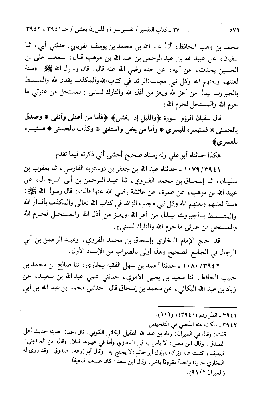 3941 - حَدَّثَنَاهُ عَبْدُ اللَّهِ بْنُ جَعْفَرِ بْنِ دَرَسْتَوَيْهِ الْفَارِسِيُّ، ثنا يَعْقُوبُ بْنُ سُفْيَانَ، ثنا إِسْحَاقُ بْنُ مُحَمَّدٍ الْفَرْوِيُّ، ثنا عَبْدُ الرَّحْمَنِ بْنُ أَبِي الرِّجَالِ، عَنْ عُبَيْدِ اللَّهِ بْنِ مَوْهَبٍ، عَنْ عَمْرَةَ، عَنْ عَائِشَةَ رَضِيَ اللَّهُ عَنْهَا، قَالَتْ: قَالَ رَسُولُ اللَّهِ صَلَّى اللهُ عَلَيْهِ وَسَلَّمَ: §«سِتَّةٌ لَعَنْتُهُمْ وَلَعَنَهُمُ اللَّهُ وَكُلُّ نَبِيٍّ مُجَابٌ؛ الزَّائِدُ فِي كِتَابِ اللَّهِ تَعَالَى، وَالْمُكَذِّبُ بِأَقْدَارِ اللَّهِ، وَالْمُتَسَلِّطُ بِالْجَبَرُوتِ لِيُذِلَّ مَنْ أَعَزَّ اللَّهُ وَيُعِزَّ مَنْ أَذَلَّ اللَّهُ، وَالْمُسْتَحِلُّ لِحَرَمِ اللَّهِ، وَالْمُسْتَحِلُّ مِنْ عِتْرَتِي مَا حَرَّمَ اللَّهُ، وَالتَّارِكُ لِسُنَّتِي» قَدِ احْتَجَّ الْإِمَامُ الْبُخَارِيُّ بِإِسْحَاقَ بْنِ مُحَمَّدٍ الْفَرْوِيِّ وَعَبْدِ الرَّحْمَنِ بْنِ أَبِي الرِّجَالِ فِي الْجَامِعِ الصَّحِيحِ، وَهَذَا أَوْلَى بِالصَّوَابِ مِنَ الْإِسْنَادِ الْأَوَّلِ "