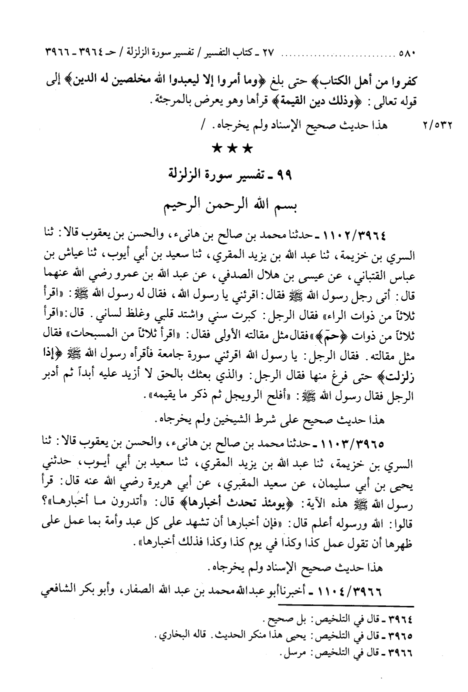 3964 - حَدَّثَنَا مُحَمَّدُ بْنُ صَالِحِ بْنِ هَانِئٍ، وَالْحَسَنُ بْنُ يَعْقُوبَ، قَالَا: ثنا السَّرِيُّ بْنُ خُزَيْمَةَ، ثنا عَبْدُ اللَّهِ بْنُ يَزِيدَ الْمُقْرِئُ، ثنا سَعِيدُ بْنُ أَبِي أَيُّوبَ، ثنا عَيَّاشُ بْنُ عَبَّاسٍ الْقِتْبَانِيُّ، عَنْ عِيسَى بْنِ هِلَالٍ الصَّدَفِيِّ، عَنْ عَبْدِ اللَّهِ بْنِ عَمْرٍو رَضِيَ اللَّهُ عَنْهُمَا، قَالَ: أَتَى رَجُلٌ رَسُولَ اللَّهِ صَلَّى اللهُ عَلَيْهِ وَسَلَّمَ، فَقَالَ: أَقْرِئْنِي يَا رَسُولَ اللَّهِ، فَقَالَ لَهُ رَسُولُ اللَّهِ صَلَّى اللهُ عَلَيْهِ وَسَلَّمَ: «§اقْرَأْ ثَلَاثًا مِنْ ذَوَاتِ الرَّاءِ» فَقَالَ الرَّجُلُ: كَبِرَتْ سِنِّي، وَاشْتَدَّ قَلْبِي، وَغَلُظَ لِسَانِي، قَالَ: «اقْرَأْ ثَلَاثًا مِنْ ذَوَاتِ حم» فَقَالَ مِثْلَ مَقَالَتِهِ الْأُولَى فَقَالَ: «اقْرَأْ ثَلَاثًا مِنَ الْمُسَبِّحَاتِ» فَقَالَ مِثْلَ مَقَالَتِهِ فَقَالَ الرَّجُلُ: يَا رَسُولَ اللَّهِ، أَقْرِئْنِي سُورَةً جَامِعَةً. فَأَقْرَأَهُ رَسُولُ اللَّهِ صَلَّى اللهُ عَلَيْهِ وَسَلَّمَ {إِذَا زُلْزِلَتْ} [الزلزلة: 1] حَتَّى فَرَغَ مِنْهَا فَقَالَ الرَّجُلُ: وَالَّذِي بَعَثَكَ بِالْحَقِّ لَا أَزِيدُ عَلَيْهِ أَبَدًا. ثُمَّ أَدْبَرَ الرَّجُلُ فَقَالَ رَسُولُ اللَّهِ صَلَّى اللهُ عَلَيْهِ وَسَلَّمَ: «أَفْلَحَ الرُّوَيْجِلُ» ثُمَّ ذَكَرَ مَا يُقِيمُهُ «هَذَا حَدِيثٌ صَحِيحٌ عَلَى شَرْطِ الشَّيْخَيْنِ وَلَمْ يُخَرِّجَاهُ» K3964 - بل صحيح