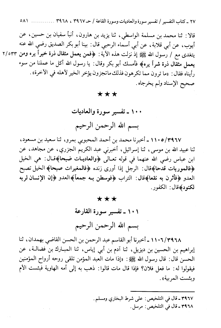 3967 - أَخْبَرَنَا مُحَمَّدُ بْنُ أَحْمَدَ الْمَحْبُوبِيُّ بِمَرْوَ، ثنا سَعِيدُ بْنُ مَسْعُودٍ، ثنا عُبَيْدُ اللَّهِ بْنُ مُوسَى، ثنا إِسْرَائِيلُ، أَخْبَرَنِي عَبْدُ الْكَرِيمِ الْجَزَرِيُّ، عَنْ مُجَاهِدٍ، عَنِ ابْنِ عَبَّاسٍ رَضِيَ اللَّهُ عَنْهُمَا، فِي قَوْلِهِ تَعَالَى: {§وَالْعَادِيَاتِ ضَبْحًا} [العاديات: 1] قَالَ: «هِيَ الْخَيْلُ» {فَالْمُورِيَاتِ قَدْحًا} [العاديات: 2] قَالَ: «الرَّجُلُ إِذَا أَوْرَى زَنْدَهُ» {فَالْمُغِيرَاتِ صُبْحًا} [العاديات: 3] الْخَيْلُ تُصَبِّحُ الْعَدُوَّ {فَأَثَرْنَ بِهِ نَقْعًا} [العاديات: 4] قَالَ: «التُّرَابُ» {فَوَسَطْنَ بِهِ جَمْعًا} [العاديات: 5] الْعَدُوُّ {إِنَّ الْإِنْسَانَ لِرَبِّهِ لَكَنُودٌ} [العاديات: 6] قَالَ: «الْكُفُورُ» K3967 - على شرط البخاري ومسلم