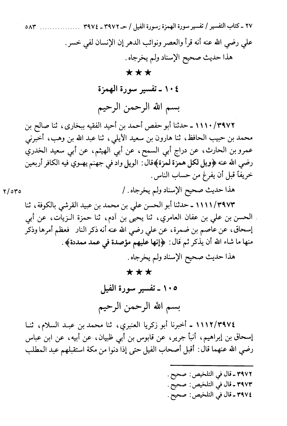 3972 - حَدَّثَنَا أَبُو حَفْصٍ أَحْمَدُ بْنُ أَحْيَدَ الْفَقِيهُ بِبُخَارَى، ثنا صَالِحُ بْنُ مُحَمَّدِ بْنِ حَبِيبٍ الْحَافِظُ، ثنا هَارُونُ بْنُ سَعِيدٍ الْأَيْلِيُّ، ثنا عَبْدُ اللَّهِ بْنُ وَهْبٍ، أَخْبَرَنِي عَمْرُو بْنُ الْحَارِثِ، عَنْ دَرَّاجٍ أَبِي السَّمْحِ، عَنْ أَبِي الْهَيْثَمِ، عَنْ أَبِي سَعِيدٍ الْخُدْرِيِّ رَضِيَ اللَّهُ عَنْهُ، {§وَيْلٌ لِكُلِّ هُمَزَةٍ لُمَزَةٍ} [الهمزة: 1] قَالَ: «الْوَيْلُ وَادٍ فِي جَهَنَّمَ يَهْوِي فِيهِ الْكَافِرُ أَرْبَعِينَ خَرِيفًا قَبْلَ أَنْ يَفْرُغَ مِنْ حِسَابِ النَّاسِ» هَذَا حَدِيثٌ صَحِيحُ الْإِسْنَادِ وَلَمْ يُخَرِّجَاهُ "K3972 - صحيح