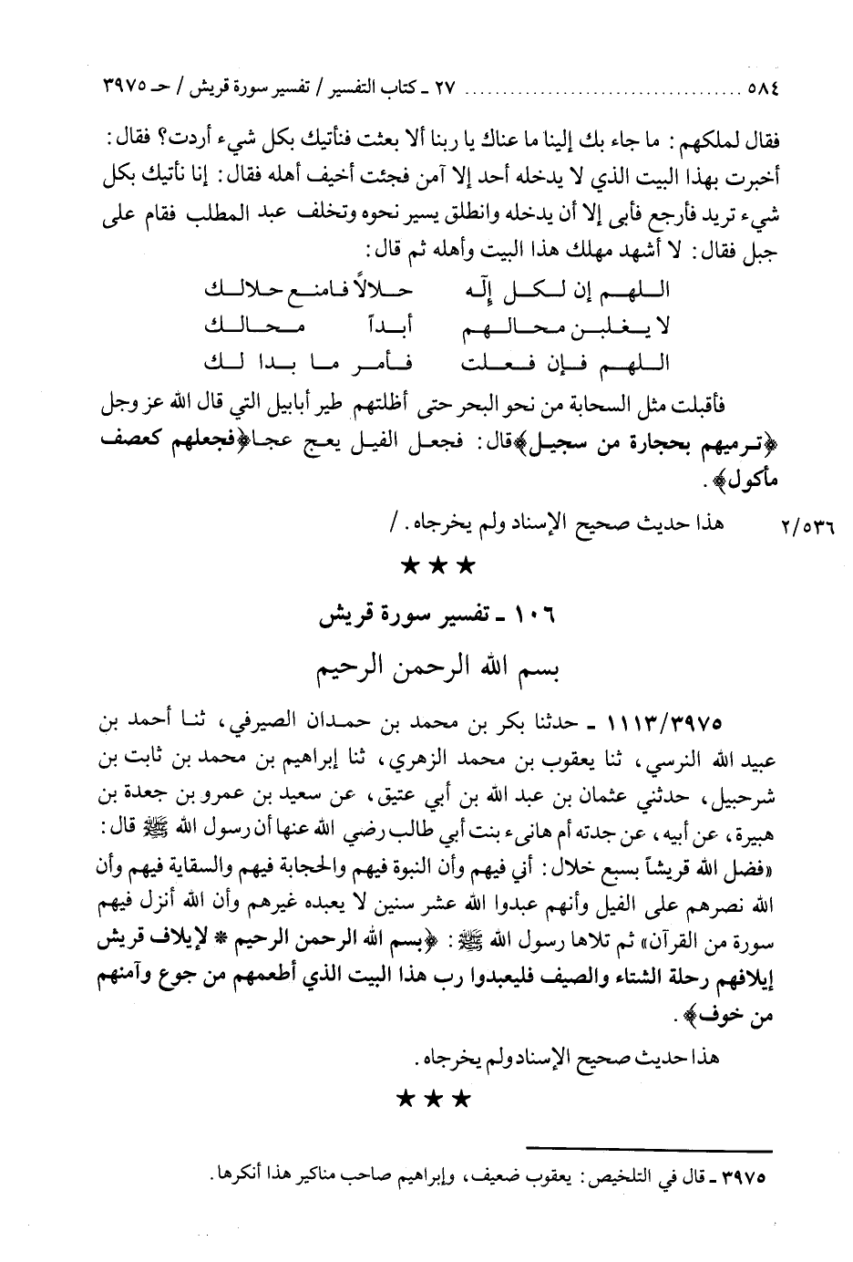 3975 - حَدَّثَنَا بَكْرُ بْنُ مُحَمَّدِ بْنِ حَمْدَانَ الصَّيْرَفِيُّ، ثنا أَحْمَدُ بْنُ عُبَيْدِ اللَّهِ النَّرْسِيُّ، ثنا يَعْقُوبُ بْنُ مُحَمَّدٍ الزُّهْرِيُّ، ثنا إِبْرَاهِيمُ بْنُ مُحَمَّدِ بْنِ ثَابِتِ بْنِ شُرَحْبِيلَ، حَدَّثَنِي عُثْمَانُ بْنُ عَبْدِ اللَّهِ بْنِ أَبِي عَتِيقٍ، عَنْ سَعِيدِ بْنِ عَمْرِو بْنِ جَعْدَةَ بْنِ هُبَيْرَةَ، عَنْ أَبِيهِ، عَنْ جَدَّتِهِ أُمِّ هَانِئٍ بِنْتِ أَبِي طَالِبٍ رَضِيَ اللَّهُ عَنْهَا، أَنَّ رَسُولَ اللَّهِ صَلَّى اللهُ عَلَيْهِ وَسَلَّمَ، قَالَ: §«فَضَّلَ اللَّهُ قُرَيْشًا بِسَبْعِ خِلَالٍ؛ أَنِّي فِيهِمْ وَأَنَّ النُّبُوَّةَ فِيهِمْ، وَالْحِجَابَةَ فِيهِمْ، وَالسِّقَايَةَ فِيهِمْ، وَأَنَّ اللَّهَ نَصَرَهُمْ عَلَى الْفِيلِ، وَأَنَّهُمْ عَبَدُوا اللَّهَ عَشْرَ سِنِينَ لَا يَعْبُدُهُ غَيْرُهُمْ، وَأَنَّ اللَّهَ أَنْزَلَ فِيهِمْ سُورَةً مِنَ الْقُرْآنِ» ثُمَّ تَلَاهَا رَسُولُ اللَّهِ صَلَّى اللهُ عَلَيْهِ وَسَلَّمَ، بِسْمِ اللَّهِ الرَّحْمَنِ الرَّحِيمِ {لِإِيلَافِ قُرَيْشٍ إِيلَافِهِمْ رِحْلَةَ الشِّتَاءِ وَالصَّيْفِ، فَلْيَعْبُدُوا رَبَّ هَذَا الْبَيْتِ الَّذِي أَطْعَمَهُمْ مِنْ جُوعٍ وَآمَنَهُمْ مِنْ خَوْفٍ} [قريش: 2] «هَذَا حَدِيثٌ صَحِيحُ الْإِسْنَادِ وَلَمْ يُخَرِّجَاهُ» K3975 - يعقوب ضعيف وإبراهيم صاحب مناكير هذا أنكرها