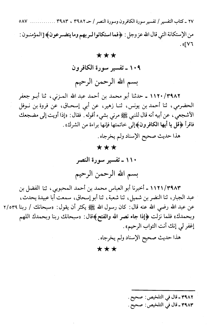 3983 - أَخْبَرَنَا أَبُو الْعَبَّاسِ مُحَمَّدُ بْنُ أَحْمَدَ الْمَحْبُوبِيُّ، ثنا الْفَضْلُ بْنُ عَبْدِ الْجَبَّارِ، ثنا النَّضْرُ بْنُ شُمَيْلٍ، ثنا شُعْبَةُ، ثنا أَبُو إِسْحَاقَ، سَمِعْتُ أَبَا عُبَيْدَةَ، يُحَدِّثُ عَنْ عَبْدِ اللَّهِ رَضِيَ اللَّهُ عَنْهُ، قَالَ: كَانَ رَسُولُ اللَّهِ صَلَّى اللهُ عَلَيْهِ وَسَلَّمَ يُكْثِرُ أَنْ يَقُولَ: «§سُبْحَانَكَ رَبَّنَا وَبِحَمْدِكَ» ، فَلَمَّا نَزَلَتْ إِذَا جَاءَ نَصْرُ اللَّهِ وَالْفَتْحُ قَالَ: «سُبْحَانَكَ رَبَّنَا وَبِحَمْدِكَ اللَّهُمَّ اغْفِرْ لِي إِنَّكَ أَنْتَ التَّوَّابُ الرَّحِيمُ» هَذَا حَدِيثٌ صَحِيحُ الْإِسْنَادِ وَلَمْ يُخَرِّجَاهُ "K3983 - صحيح