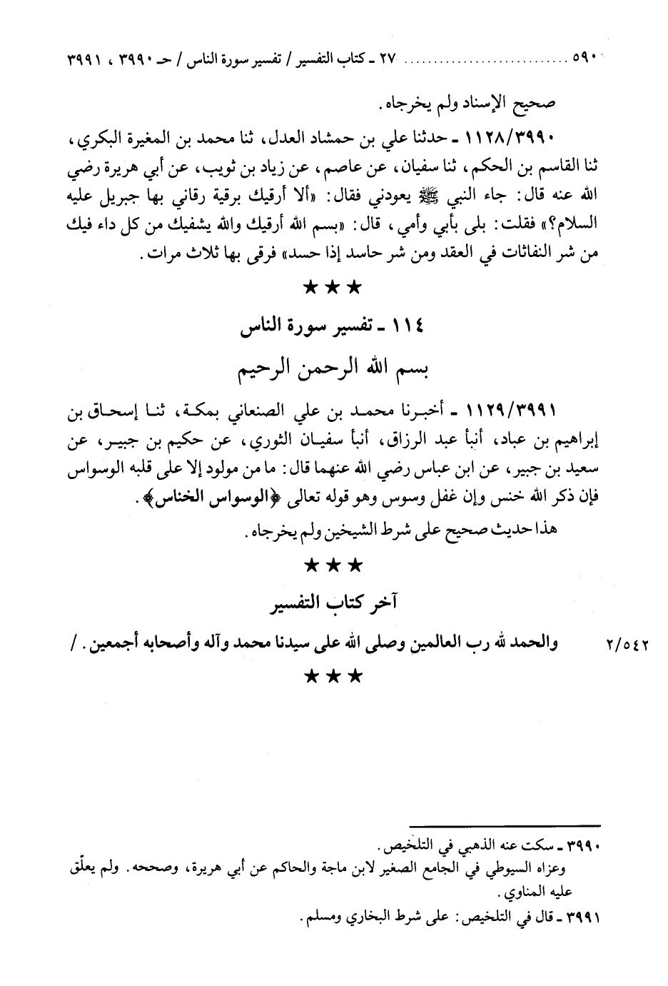 3991 - أَخْبَرَنَا مُحَمَّدُ بْنُ عَلِيٍّ الصَّنْعَانِيُّ بِمَكَّةَ، ثنا إِسْحَاقُ بْنُ إِبْرَاهِيمَ بْنِ عَبَّادٍ، أَنْبَأَ عَبْدُ الرَّزَّاقِ، أَنْبَأَ سُفْيَانُ الثَّوْرِيُّ، عَنْ حَكِيمِ بْنِ جُبَيْرٍ، عَنْ سَعِيدِ بْنِ جُبَيْرٍ، عَنِ ابْنِ عَبَّاسٍ رَضِيَ اللَّهُ عَنْهُمَا، قَالَ: §" مَا مِنْ مَوْلُودٍ إِلَّا عَلَى قَلْبِهِ الْوَسْوَاسُ، فَإِنْ ذَكَرَ اللَّهَ خَنَسَ، وَإِنْ غَفَلَ وَسْوَسَ وَهُوَ قَوْلُهُ تَعَالَى {الْوَسْوَاسِ الْخَنَّاسِ} [الناس: 4] «هَذَا حَدِيثٌ صَحِيحٌ عَلَى شَرْطِ الشَّيْخَيْنِ وَلَمْ يُخَرِّجَاهُ» ، آخِرُ كِتَابِ التَّفْسِيرِ وَالْحَمْدُ لِلَّهِ رَبِّ الْعَالَمِينَ، وَصَلَّى اللَّهُ عَلَى سَيِّدِنَا مُحَمَّدٍ وَآلِهِ وَأَصْحَابِهِ أَجْمَعِينَK3991 - على شرط البخاري ومسلم