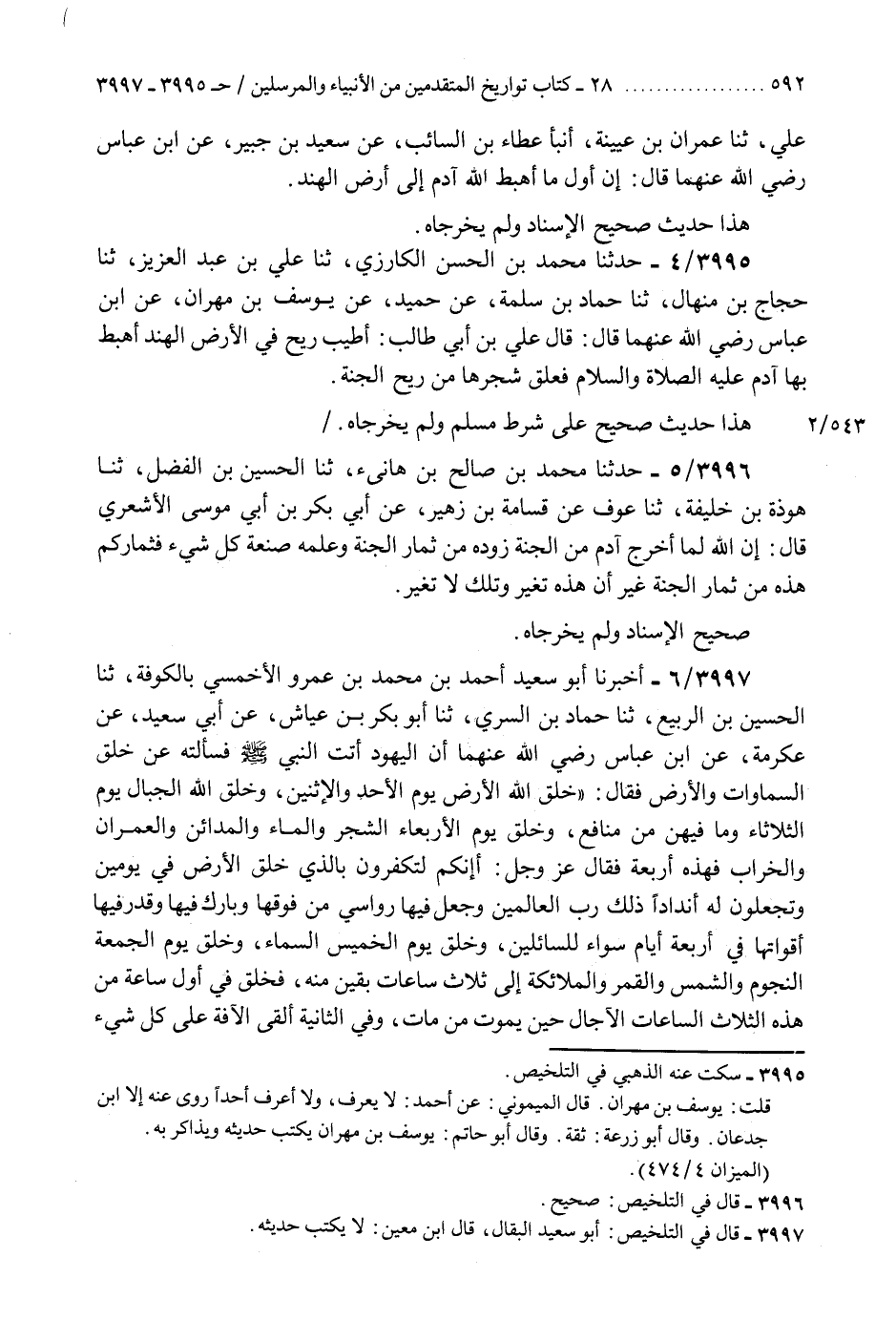 3997 - أَخْبَرَنَا أَبُو سَعِيدٍ أَحْمَدُ بْنُ مُحَمَّدِ بْنِ عَمْرٍو الْأَحْمَسِيُّ بِالْكُوفَةِ، ثنا الْحُسَيْنُ بْنُ الرَّبِيعِ، ثنا حَمَّادُ بْنُ السَّرِيِّ، ثنا أَبُو بَكْرِ بْنُ عَيَّاشٍ، عَنْ أَبِي سَعِيدٍ، عَنْ عِكْرِمَةَ، عَنِ ابْنِ عَبَّاسٍ رَضِيَ اللَّهُ عَنْهُمَا، أَنَّ الْيَهُودَ أَتَتِ النَّبِيَّ صَلَّى اللهُ عَلَيْهِ وَسَلَّمَ، فَسَأَلَتْهُ عَنْ خَلْقِ السَّمَاوَاتِ وَالْأَرْضِ، فَقَالَ: «§خَلَقَ اللَّهُ الْأَرْضَ يَوْمَ الْأَحَدِ وَالِاثْنَيْنِ، وَخَلَقَ اللَّهُ الْجِبَالَ يَوْمَ الثُّلَاثَاءِ وَمَا فِيهِنَّ مِنْ مَنَافِعَ، وَخَلَقَ يَوْمَ الْأَرْبِعَاءِ الشَّجَرَ وَالْمَاءَ وَالْمَدَائِنَ وَالْعُمْرَانَ وَالْخَرَابَ فَهَذِهِ أَرْبَعَةٌ» فَقَالَ عَزَّ وَجَلَّ: « {أَإِنَّكُمْ لَتَكْفُرُونَ بِالَّذِي خَلَقَ الْأَرْضَ فِي يَوْمَيْنِ وَتَجْعَلُونَ لَهُ أَنْدَادًا ذَلِكَ رَبُّ الْعَالَمِينَ وَجَعَلَ فِيهَا رَوَاسِيَ مِنْ فَوْقِهَا وَبَارَكَ فِيهَا، وَقَدَّرَ فِيهَا أَقْوَاتَهَا فِي أَرْبَعَةِ أَيَّامٍ سَوَاءً لِلسَّائِلِينَ} وَخَلَقَ يَوْمَ الْخَمِيسِ السَّمَاءَ، وَخَلَقَ يَوْمَ الْجُمُعَةِ النُّجُومَ وَالشَّمْسَ وَالْقَمَرَ وَالْمَلَائِكَةَ إِلَى ثَلَاثِ سَاعَاتٍ بَقِينَ مِنْهُ فَخَلَقَ فِي أَوَّلِ سَاعَةٍ مِنْ هَذِهِ الثَّلَاثِ السَّاعَاتِ الْآجَالَ حِينَ يَمُوتُ مَنْ مَاتَ، وَفِي الثَّانِيَةِ أَلْقَى الْآفَةَ عَلَى كُلِّ شَيْءٍ مِمَّا يَنْتَفِعُ بِهِ النَّاسَ، وَفِي الثَّالِثَةِ آدَمَ أَسْكَنَهُ الْجَنَّةَ، وَأَمَرَ إِبْلِيسَ بِالسُّجُودِ لَهُ، وَأَخْرَجَهُ مِنْهَا فِي آخِرِ سَاعَةٍ» ثُمَّ قَالَتِ الْيَهُودُ: ثُمَّ مَاذَا يَا مُحَمَّدُ؟ قَالَ: «ثُمَّ اسْتَوَى عَلَى الْعَرْشِ» قَالُوا: قَدْ أَصَبْتَ لَوْ أَتْمَمْتَ، قَالُوا: ثُمَّ اسْتَرَاحَ، قَالَ: فَغَضِبَ النَّبِيُّ صَلَّى اللهُ عَلَيْهِ وَسَلَّمَ غَضَبًا شَدِيدًا، فَنَزَلَتْ {وَلَقَدْ خَلَقْنَا السَّمَوَاتِ وَالْأَرْضَ وَمَا بَيْنَهُمَا فِي سِتَّةِ أَيَّامٍ وَمَا مَسَّنَا مِنْ لُغُوبِ فَاصْبِرْ عَلَى مَا يَقُولُونَ} «هَذَا حَدِيثٌ صَحِيحُ الْإِسْنَادِ وَلَمْ يُخَرِّجَاهُ» K3997 - أبو سعيد البقال قال ابن معين لا يكتب حديثه