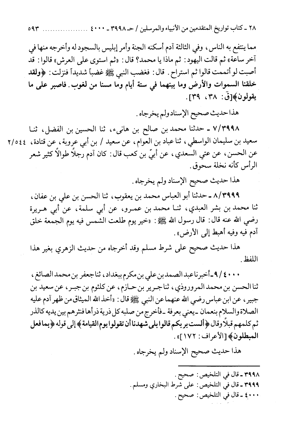4000 - أَخْبَرَنَا عَبْدُ الصَّمَدِ بْنُ عَلِيِّ بْنِ مُكْرَمٍ، بِبَغْدَادَ، ثنا جَعْفَرُ بْنُ مُحَمَّدٍ الصَّائِغُ، ثنا الْحَسَنُ بْنُ مُحَمَّدٍ الْمَرْوَزِيُّ، ثنا جَرِيرُ بْنُ حَازِمٍ، عَنْ كُلْثُومِ بْنِ جَبْرٍ، عَنْ سَعِيدِ بْنِ جُبَيْرٍ، عَنِ ابْنِ عَبَّاسٍ رَضِيَ اللَّهُ عَنْهُمَا، عَنِ النَّبِيِّ صَلَّى اللهُ عَلَيْهِ وَسَلَّمَ قَالَ: " §أَخَذَ اللَّهُ الْمِيثَاقَ مِنْ ظَهْرِ آدَمَ بِنَعْمَانَ، يَعْنِي بِعَرَفَةَ، فَأَخْرَجَ مِنْ صُلْبِهِ كُلَّ ذُرِّيَّةٍ ذَرَأَهَا فَنَثَرَهُمْ بَيْنَ يَدَيْهِ كَالذَّرِّ، ثُمَّ كَلَّمَهُمْ قُبُلًا وَقَالَ: {أَلَسْتُ بِرَبِّكُمْ قَالُوا بَلَى شَهِدْنَا أَنْ تَقُولُوا يَوْمَ الْقِيَامَةِ} [الأعراف: 172] إِلَى قَوْلِهِ {بِمَا فَعَلَ الْمُبْطِلُونَ} [الأعراف: 173] «هَذَا حَدِيثٌ صَحِيحُ الْإِسْنَادِ وَلَمْ يُخَرِّجَاهُ» K4000 - صحيح