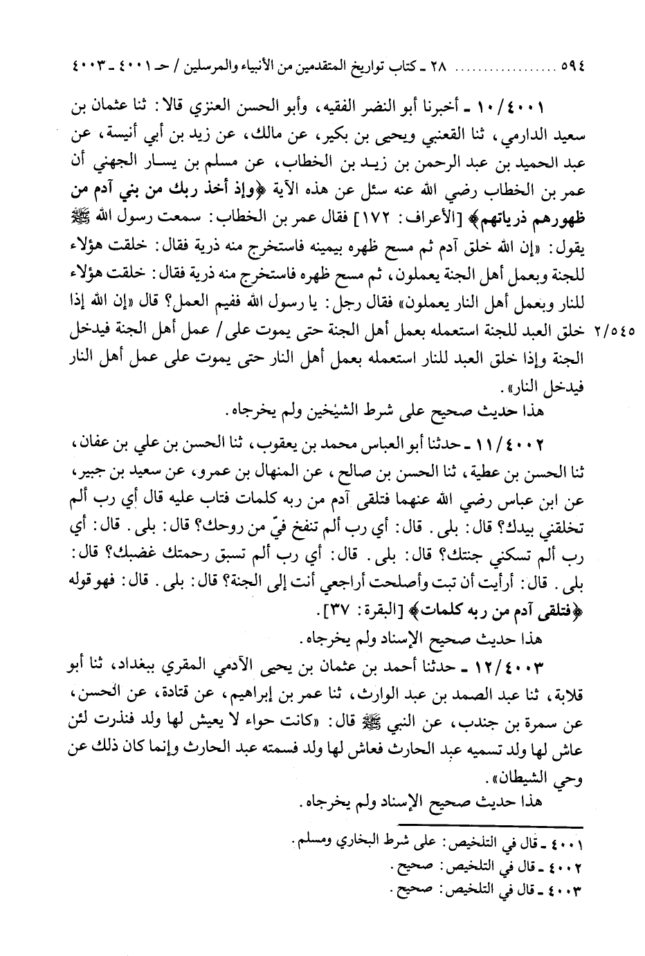 4002 - حَدَّثَنَا أَبُو الْعَبَّاسِ مُحَمَّدُ بْنُ يَعْقُوبَ، ثنا الْحَسَنُ بْنُ عَلِيِّ بْنِ عَفَّانَ، ثنا الْحَسَنُ بْنُ عَطِيَّةَ، ثنا الْحَسَنُ بْنُ صَالِحٍ، عَنِ الْمِنْهَالِ بْنِ عَمْرٍو، عَنْ سَعِيدِ بْنِ جُبَيْرٍ، عَنِ ابْنِ عَبَّاسٍ رَضِيَ اللَّهُ عَنْهُمَا، §فَتَلَقَّى آدَمُ مِنْ رَبِّهِ كَلِمَاتٍ فَتَابَ عَلَيْهِ قَالَ: أَيْ رَبِّ أَلَمْ تَخْلُقْنِي بِيَدِكَ؟ قَالَ: «بَلَى» . قَالَ: أَيْ رَبِّ، أَلَمْ تَنْفُخْ فِيَّ مِنْ رُوحِكَ؟ قَالَ: «بَلَى» . قَالَ: أَيْ رَبِّ، أَلَمْ تُسْكِنِّي جَنَّتَكَ؟ قَالَ: «بَلَى» . قَالَ: أَيْ رَبِّ أَلَمْ تَسْبِقْ رَحْمَتُكَ غَضَبَكَ؟ قَالَ: «بَلَى» . قَالَ: أَرَأَيْتَ إِنْ تُبْتُ وَأَصْلَحْتُ أَرَاجِعِي أَنْتَ إِلَى الْجَنَّةِ؟ قَالَ: «بَلَى» . قَالَ: فَهُوَ قَوْلُهُ {فَتَلَقَّى آدَمُ مِنْ رَبِّهِ كَلِمَاتٍ} [البقرة: 37] «هَذَا حَدِيثٌ صَحِيحُ الْإِسْنَادِ وَلَمْ يُخَرِّجَاهُ» K4002 - صحيح