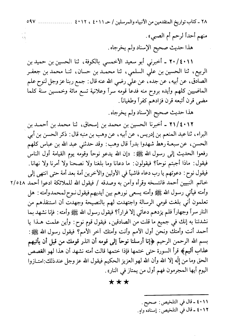 4011 - أَخْبَرَنِي أَبُو سَعِيدٍ الْأَحْمَسِيُّ، بِالْكُوفَةِ، ثنا الْحُسَيْنُ بْنُ حُمَيْدِ بْنِ الرَّبِيعِ، ثنا الْحُسَيْنُ بْنُ عَلِيٍّ السُّلَمِيُّ، ثنا مُحَمَّدُ بْنُ حَسَّانَ، ثنا مُحَمَّدُ بْنُ جَعْفَرٍ الصَّادِقُ، عَنْ أَبِيهِ، عَنْ جَدِّهِ، عَنْ عَلِيٍّ رَضِيَ اللَّهُ عَنْهُ، قَالَ: §«جَمَعَ رَبُّنَا عَزَّ وَجَلَّ لِنُوحٍ عِلْمَ الْمَاضِينَ كُلِّهِمْ وَأَيَّدَهُ بِرُوحٍ مِنْهُ، فَدَعَا قَوْمَهُ سِرًّا وَعَلَانِيَةً تِسْعَ مِائَةٍ وَخَمْسِينَ سَنَةً، كُلَّمَا مَضَى قَرْنٌ اتَّبَعَهُ قَرْنٌ فَزَادَهُمْ كُفْرًا وَطُغْيَانًا» هَذَا حَدِيثٌ صَحِيحُ الْإِسْنَادِ وَلَمْ يُخَرِّجَاهُ "K4011 - صحيح