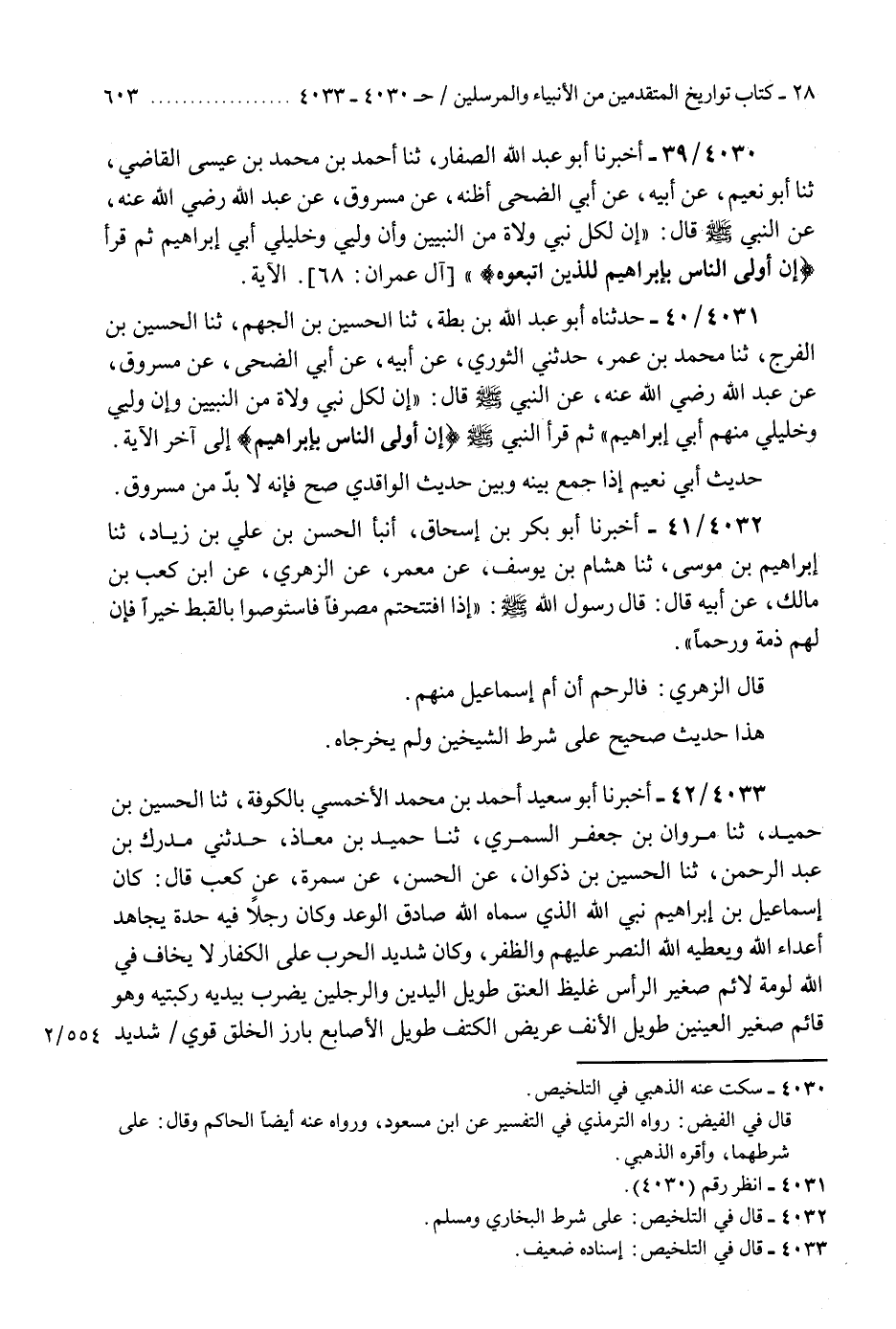 4030 - أَخْبَرَنَا أَبُو عَبْدِ اللَّهِ الصَّفَّارُ، ثنا أَحْمَدُ بْنُ مُحَمَّدِ بْنِ عِيسَى الْقَاضِي، ثنا أَبُو نُعَيْمٍ، عَنْ أَبِيهِ، عَنْ أَبِي الضُّحَى، أَظُنُّهُ عَنْ مَسْرُوقٍ، عَنْ عَبْدِ اللَّهِ رَضِيَ اللَّهُ عَنْهُ، عَنِ النَّبِيِّ صَلَّى اللهُ عَلَيْهِ وَسَلَّمَ قَالَ: «§إِنَّ لِكُلِّ نَبِيٍّ وُلَاةً مِنَ النَّبِيِّينَ، وَإِنَّ وَلِيِّي وَخَلِيلِي أَبِي إِبْرَاهِيمُ» ثُمَّ قَرَأَ {إِنَّ أَوْلَى النَّاسِ بِإِبْرَاهِيمَ لَلَّذِينَ اتَّبَعُوهُ} [آل عمران: 68] K4030 - سكت عنه الذهبي في التلخيص