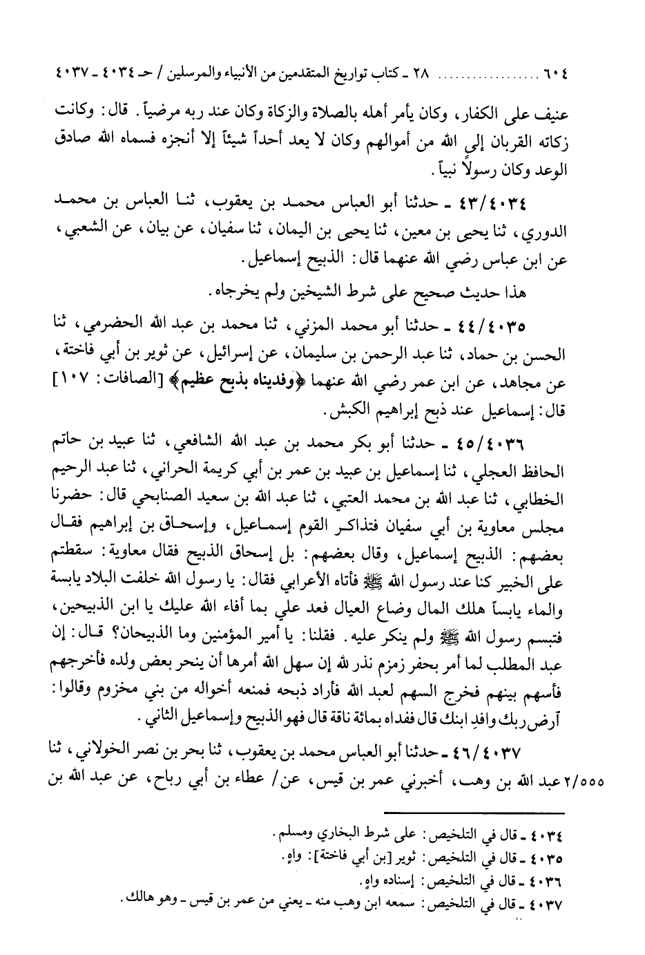 4034 - حَدَّثَنَا أَبُو الْعَبَّاسِ مُحَمَّدُ بْنُ يَعْقُوبَ، ثنا الْعَبَّاسُ بْنُ مُحَمَّدٍ الدُّورِيُّ، ثنا يَحْيَى بْنُ مَعِينٍ، ثنا يَحْيَى بْنُ الْيَمَانِ، ثنا سُفْيَانُ، عَنْ بَيَانٍ، عَنِ الشَّعْبِيِّ، عَنِ ابْنِ عَبَّاسٍ رَضِيَ اللَّهُ عَنْهُمَا قَالَ: §«الذَّبِيحُ إِسْمَاعِيلُ» هَذَا حَدِيثٌ صَحِيحٌ عَلَى شَرْطِ الشَّيْخَيْنِ وَلَمْ يُخَرِّجَاهُ "K4034 - على شرط البخاري ومسلم