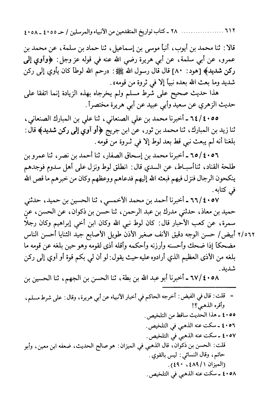 4057 - أَخْبَرَنَا أَحْمَدُ بْنُ مُحَمَّدٍ الْأَحْمَسِيُّ، ثنا الْحُسَيْنُ بْنُ حُمَيْدٍ، حَدَّثَنِي حُمَيْدُ بْنُ مُعَاذٍ، حَدَّثَنِي مُدْرِكُ بْنُ عَبْدِ الرَّحْمَنِ، ثنا حَسَنُ بْنُ ذَكْوَانَ، عَنِ الْحَسَنِ، عَنْ سَمُرَةَ، عَنْ كَعْبِ الْأَحْبَارِ، قَالَ: " §كَانَ لُوطٌ نَبِيَّ اللَّهِ، وَكَانَ ابْنَ أَخِي إِبْرَاهِيمَ وَكَانَ رَجُلًا أَبْيَضَ حَسَنَ الْوَجْهِ دَقِيقَ الْأَنْفِ، صَغِيرَ الْأُذُنِ، طَوِيلَ الْأَصَابِعِ، جَيِّدَ الثَّنَايَا، أَحْسَنَ النَّاسِ مَضْحَكًا، إِذَا ضَحِكَ وَأَحْسَنَهُ وَأَرْزَنَهُ وَأَحْكَمَهُ وَأَقَلَّهُ أَذًى لِقَوْمِهِ وَهُوَ حِينَ بَلَغَهُ عَنْ قَوْمِهِ مَا بَلَغَهُ مِنَ الْأَذَى الْعَظِيمِ الَّذِي أَرَادُوهُ عَلَيْهِ حَيْثُ، يَقُولُ: {لَوْ أَنَّ لِيَ بِكُمْ قُوَّةً أَوْ آوِي إِلَى رُكْنٍ شَدِيدٍ} [هود: 80] "K4057 - سكت عنه الذهبي في التلخيص
