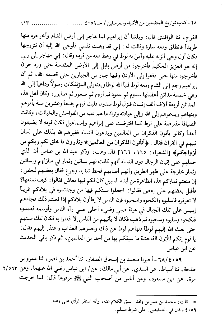 4059 - أَخْبَرَنَا مُحَمَّدُ بْنُ إِسْحَاقَ الصَّفَّارُ، ثنا أَحْمَدُ بْنُ نَصْرٍ، ثنا عَمْرُو بْنُ طَلْحَةَ، ثنا أَسْبَاطٌ، عَنِ السُّدِّيِّ، عَنْ أَبِي مَالِكٍ، عَنِ ابْنِ عَبَّاسٍ رَضِيَ اللَّهُ عَنْهُمَا، وَعَنْ مُرَّةَ، عَنِ ابْنِ مَسْعُودٍ، وَعَنْ أُنَاسٍ، مِنْ أَصْحَابِ النَّبِيِّ صَلَّى اللهُ عَلَيْهِ وَسَلَّمَ مَرْفُوعًا قَالَ: §" لَمَّا خَرَجَتِ الْمَلَائِكَةُ مِنْ عِنْدِ إِبْرَاهِيمَ نَحْوَ قَرْيَةِ لُوطٍ وَأَتَوْهَا نِصْفَ النَّهَارِ، فَلَمَّا بَلَغُوا نَهَرَ سَدُومٍ لَقَوُا ابْنَةَ لُوطٍ تَسْتَقِي مِنَ الْمَاءِ لِأَهْلِهَا وَكَانَ لَهُ ابْنَتَانِ، فَقَالُوا لَهَا: يَا جَارِيَةُ، هَلْ مِنْ مَنْزِلٍ؟ قَالَتْ: نَعَمْ، مَكَانَكُمْ لَا تَدْخُلُوا حَتَّى آتِيَكُمْ فَأَتَتْ أَبَاهَا، فَقَالَتْ: يَا أَبَتَاهُ أَدْرِكْ فِتْيَانًا عَلَى بَابِ الْمَدِينَةِ مَا رَأَيْتُ وُجُوهَ قَوْمٍ هِيَ أَحْسَنُ مِنْهُمْ لَا يَأْخُذُهُمْ قَوْمُكَ فَيَفْضَحُوهُمْ، وَقَدْ كَانَ قَوْمُهُ نَهَوْهُ أَنْ يُضِيفَ رَجُلًا حَتَّى قَالُوا: حَلَّ عَلَيْنَا فَلْيُضَيِّفِ الرِّجَالَ فَجَاءَهُمْ وَلَمْ يُعْلِمْ أَحَدًا إِلَّا بَيْتَ أَهْلِ لُوطٍ، فَخَرَجَتِ امْرَأَتُهُ فَأَخْبَرَتْ قَوْمَهُ، قَالَتْ: إِنَّ فِي بَيْتِ لُوطٍ رِجَالًا مَا رَأَيْتُ مِثْلَ وُجُوهِهِمْ قَطُّ، فَجَاءَهُ قَوْمُهُ يُهْرَعُونَ إِلَيْهِ، فَلَمَّا أَتَوْهُ قَالَ لَهُمْ لُوطٌ: «يَا قَوْمِ اتَّقُوا اللَّهَ وَلَا تُخْزُونِ فِي ضَيْفِي أَلَيْسَ مِنْكُمْ رَجُلٌ رُشَيْدٌ هَؤُلَاءِ بَنَاتِي هُنَّ أَطْهُرُ لَكُمْ مِمَّا تُرِيدُونَ» ، قَالُوا لَهُ: أَوَ لَمْ نَنْهَكَ إِنْ تُضَيِّفَ الرِّجَالَ قَدْ عَلِمْتَ أَنَّ مَا لَنَا فِي بَنَاتِكَ مِنْ حَقٍّ، وَإِنَّكَ لَتَعْلَمُ مَا نُرِيدُ، فَلَمَّا لَمْ يَقْبَلُوا مِنْهُ مَا عَرَضَهُ عَلَيْهِمْ، قَالَ: «لَوْ أَنَّ لِيَ بِكُمْ قُوَّةً أَوْ آوِي إِلَى رُكْنٍ شَدِيدٍ» يَقُولُ صَلَوَاتُ اللَّهِ عَلَيْهِ: «لَوْ أَنَّ لِي أَنْصَارًا يَنْصُرُونِي عَلَيْكُمْ أَوْ عَشِيرَةً تَمْنَعُنِي مِنْكُمْ لَحَالَتْ بَيْنَكُمْ وَبَيْنَ مَا جِئْتُمْ تُرِيدُونَهُ مِنْ أَضْيَافِي» وَلَمَّا قَالَ لُوطٌ: " لَوْ أَنَّ لِيَ بِكُمْ قُوَّةً أَوْ آوِي إِلَى رُكْنٍ شَدِيدٍ بَسَطَ حِينَئِذٍ جِبْرِيلُ جَنَاحَيْهِ فَفَقَأَ أَعْيُنَهُمْ وَخَرَجُوا يَدُوسُ بَعْضُهُمْ فِي آثَارِ بَعْضٍ عُمْيَانًا، يَقُولُونَ: النَّجَا النَّجَا، فَإِنَّ فِي بَيْتِ لُوطٍ أَسْحَرَ قَوْمٍ فِي الْأَرْضِ فَذَلِكَ قَوْلُ اللَّهِ عَزَّ وَجَلَّ {وَلَقَدْ رَاوَدُوهُ عَنْ ضَيْفِهِ فَطَمَسْنَا أَعْيُنَهُمْ} [القمر: 37] وَقَالُوا: يَا لُوطُ إِنَّا رُسُلُ رَبِّكَ لَنْ يَصِلُوا إِلَيْكَ، فَأَسْرِ بِأَهْلِكَ بِقِطِعٍ مِنَ اللَّيْلِ وَلَا يَلْتَفِتْ مِنْكُمْ أَحَدٌ إِلَّا امْرَأَتُكَ فَاتَّبِعْ آثَارَ أَهْلِكَ، يَقُولُ: «وَامْضُوا حَيْثُ تُؤْمَرُونَ فَأَخْرَجَهُمُ اللَّهُ إِلَى الشَّامِ» وَقَالَ لُوطٌ: أَهْلِكُوهُمُ السَّاعَةَ فَقَالُوا: إِنَّا لَمْ نُؤْمَرْ إِلَّا بِالصُّبْحِ أَلَيْسَ الصُّبْحُ بِقَرِيبٍ فَلَمَّا أَنْ كَانَ السَّحَرُ خَرَجَ لُوطٌ وَأَهْلُهُ عَدَا امْرَأَتِهِ فَذَلِكَ قَوْلُ اللَّهِ عَزَّ وَجَلَّ: {إِلَّا آلَ لُوطٍ نَجَّيْنَاهُمْ بِسَحَرٍ} [القمر: 34] «هَذَا حَدِيثٌ صَحِيحٌ عَلَى شَرْطِ مُسْلِمٍ وَلَمْ يُخَرِّجَاهُ» K4059 - على شرط مسلم