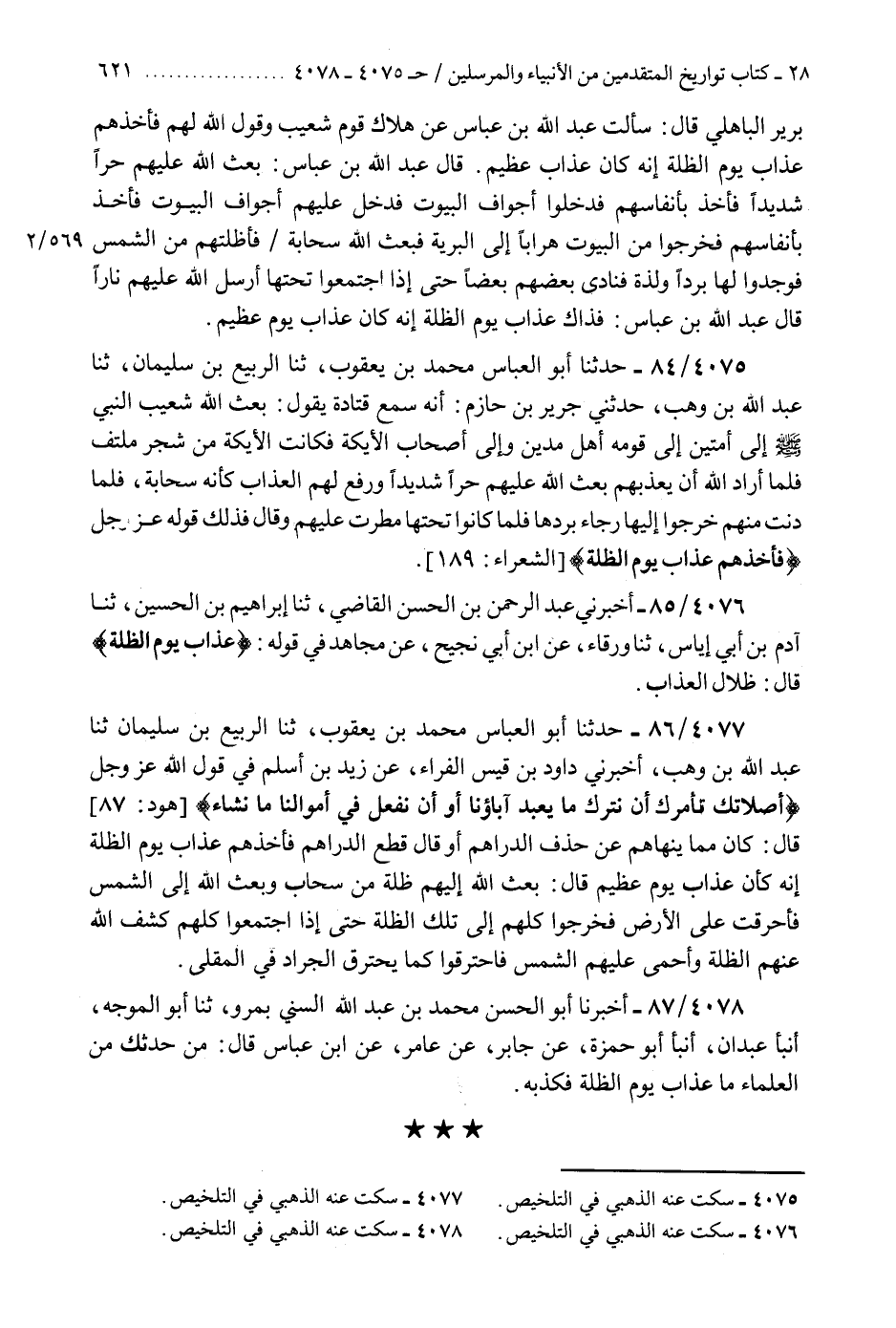 4077 - حَدَّثَنَا أَبُو الْعَبَّاسِ مُحَمَّدُ بْنُ يَعْقُوبَ، ثنا الرَّبِيعُ بْنُ سُلَيْمَانَ، ثنا عَبْدُ اللَّهِ بْنُ وَهْبٍ، أَخْبَرَنِي دَاوُدُ بْنُ قَيْسٍ الْفَرَّاءُ، عَنْ زَيْدِ بْنِ أَسْلَمَ، فِي قَوْلِ اللَّهِ عَزَّ وَجَلَّ: {§أَصَلَاتُكَ تَأْمُرُكَ أَنْ نَتْرُكَ مَا يَعْبُدُ آبَاؤُنَا أَوْ أَنْ نَفْعَلَ فِي أَمْوَالِنَا مَا نَشَاءَ} [هود: 87] قَالَ: " كَانَ مِمَّا يَنْهَاهُمْ عَنْ حَذْفِ الدَّرَاهِمِ أَوْ قَالَ قَطْعِ الدَّرَاهِمِ، فَأَخَذَهُمْ عَذَابُ يَوْمِ الظُّلَّةِ إِنَّهُ كَانَ عَذَابَ يَوْمٍ عَظِيمٍ، قَالَ: بَعَثَ اللَّهُ إِلَيْهِمْ ظُلَّةً مِنْ سَحَابٍ وَبَعَثَ اللَّهُ إِلَى الشَّمْسِ، فَأُحْرِقَتْ عَلَى الْأَرْضِ فَخَرَجُوا كُلُّهُمْ إِلَى تِلْكَ الظُّلَّةِ حَتَّى إِذَا اجْتَمَعُوا كُلُّهُمْ كَشَفَ اللَّهُ عَنْهُمُ الظُّلَّةَ وَأَحْمَى عَلَيْهِمُ الشَّمْسَ فَاحْتَرَقُوا كَمَا يَحْتَرِقُ الْجَرَادُ فِي الْمَقْلَى "K4077 - سكت عنه الذهبي في التلخيص