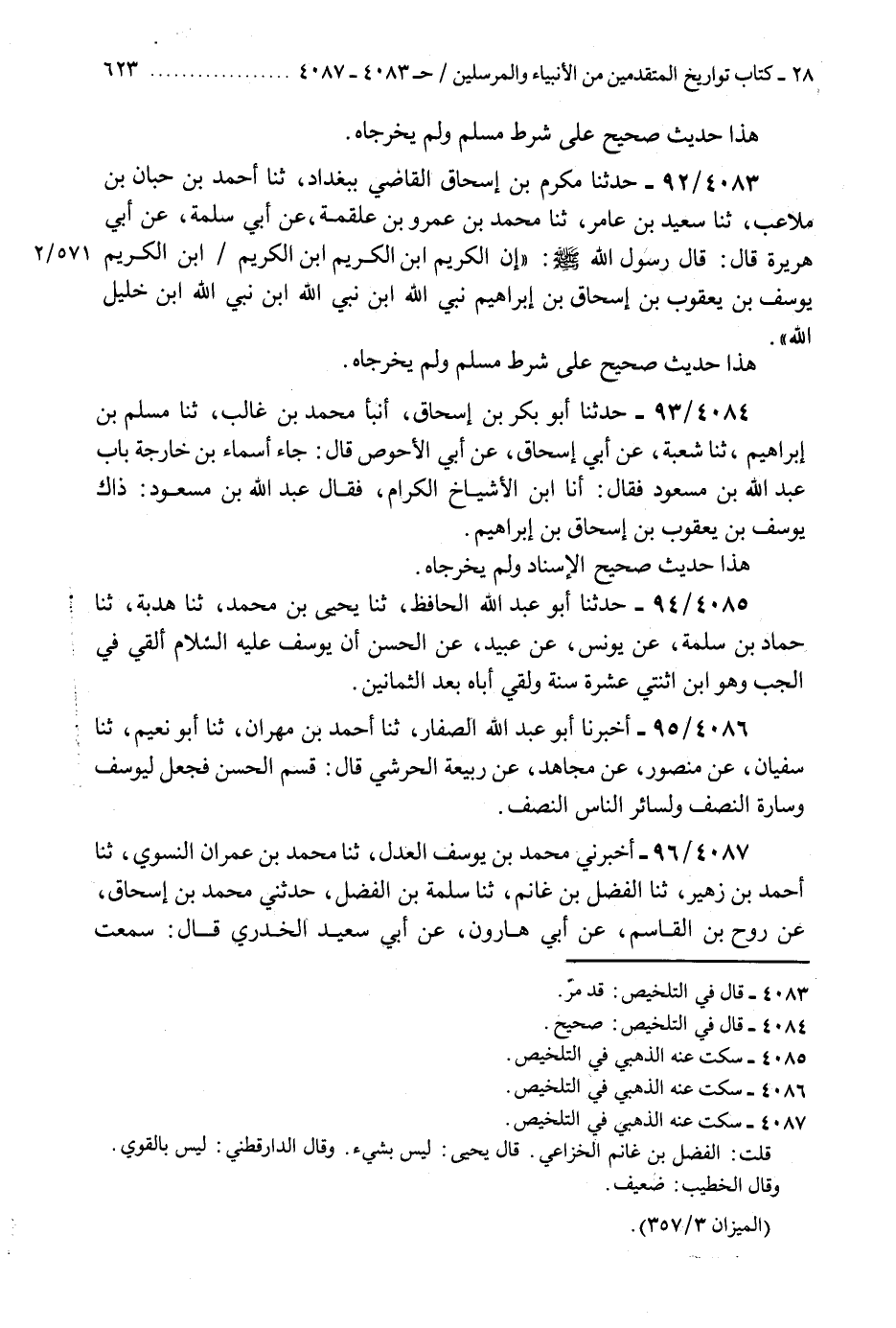 4083 - حَدَّثَنَا مُكْرَمُ بْنُ إِسْحَاقَ الْقَاضِي بِبَغْدَادَ، ثنا أَحْمَدُ بْنُ مُلَاعِبِ بْنِ حَيَّانَ، ثنا سَعِيدُ بْنُ عَامِرٍ، ثنا مُحَمَّدُ بْنُ عَمْرِو بْنِ عَلْقَمَةَ، عَنْ أَبِي سَلَمَةَ، عَنْ أَبِي هُرَيْرَةَ، قَالَ: قَالَ رَسُولُ اللَّهِ صَلَّى اللهُ عَلَيْهِ وَسَلَّمَ: §«إِنَّ الْكَرِيمَ ابْنَ الْكَرِيمِ ابْنِ الْكَرِيمِ ابْنِ الْكَرِيمِ يُوسُفُ بْنُ يَعْقُوبَ بْنِ إِسْحَاقَ بْنِ إِبْرَاهِيمَ نَبِيُّ اللَّهِ ابْنُ نَبِيِّ اللَّهِ ابْنِ نَبِيِّ اللَّهِ ابْنِ خَلِيلِ اللَّهِ» هَذَا حَدِيثٌ صَحِيحٌ عَلَى شَرْطِ مُسْلِمٍ وَلَمْ يُخَرِّجَاهُ "