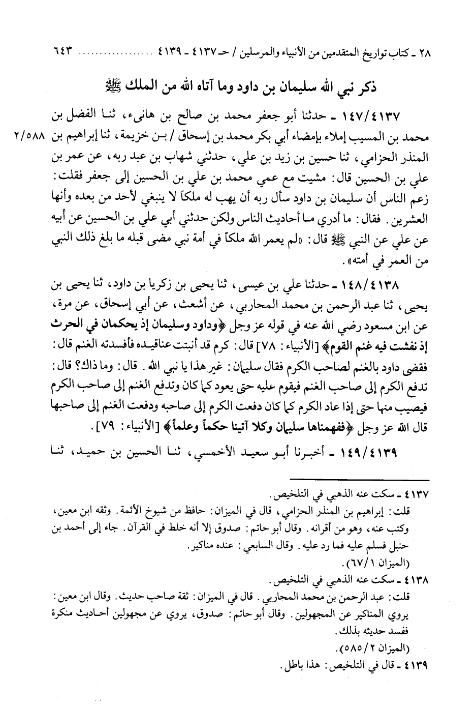 4138 - حَدَّثَنَا عَلِيُّ بْنُ عِيسَى، ثنا يَحْيَى بْنُ زَكَرِيَا بْنِ دَاوُدَ، ثنا يَحْيَى بْنُ يَحْيَى، ثنا عَبْدُ الرَّحْمَنِ بْنُ مُحَمَّدٍ الْمُحَارِبِيُّ، عَنْ أَشْعَثَ، عَنْ أَبِي إِسْحَاقَ، عَنْ مُرَّةَ، عَنِ ابْنِ مَسْعُودٍ رَضِيَ اللَّهُ عَنْهُ، فِي قَوْلِهِ عَزَّ وَجَلَّ: {وَدَاوُدَ وَسُلَيْمَانَ إِذْ يَحْكُمَانِ فِي الْحَرْثِ إِذْ نَفَشَتْ فِيهِ غَنَمُ الْقَوْمِ} قَالَ: " §كَرْمٌ قَدْ أَنْبَتَتْ عَنَاقِيدُهُ فَأَفْسَدَتْهُ الْغَنَمُ، قَالَ: فَقَضَى دَاوُدُ بِالْغَنَمِ لِصَاحِبِ الْكَرْمِ فَقَالَ سُلَيْمَانُ: غَيْرَ هَذَا يَا نَبِيَّ اللَّهِ، قَالَ: وَمَا ذَاكَ؟ قَالَ: تَدْفَعُ الْكَرْمَ إِلَى صَاحِبِ الْغَنَمِ فَيَقُومُ عَلَيْهِ حَتَّى يَعُودَ كَمَا كَانَ وَتَدْفَعُ الْغَنَمَ إِلَى صَاحِبِ الْكَرْمِ فَيُصِيبَ مِنْهَا حَتَّى إِذَا عَادَ الْكَرْمُ كَمَا كَانَ دَفَعْتَ الْكَرْمَ إِلَى صَاحِبِهِ، وَدَفَعْتَ الْغَنَمَ إِلَى صَاحِبِهَا قَالَ اللَّهُ عَزَّ وَجَلَّ: {فَفَهَّمْنَاهَا سُلَيْمَانَ وَكُلًّا آتَيْنَا حُكْمًا وَعِلْمًا} [الأنبياء: 79] "K4138 - سكت عنه الذهبي في التلخيص