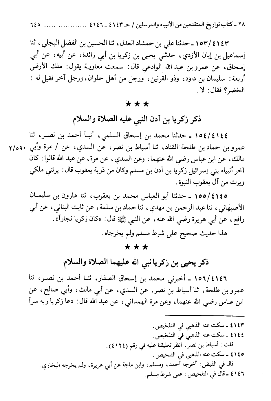 4144 - حَدَّثَنَا مُحَمَّدُ بْنُ إِسْحَاقَ السُّلَمِيُّ، أَنْبَأَ أَحْمَدُ بْنُ نَصْرٍ، ثنا عَمْرُو بْنُ حَمَّادِ بْنِ طَلْحَةَ الْقَنَّادُ، ثنا أَسْبَاطُ بْنُ نَصْرٍ، عَنِ السُّدِّيِّ، عَنْ مُرَّةَ، وَأَبِي مَالِكٍ عَنِ ابْنِ عَبَّاسٍ رَضِيَ اللَّهُ عَنْهُمَا، وَعَنِ السُّدِّيِّ، عَنْ مُرَّةَ، عَنْ عَبْدِ اللَّهِ، قَالُوا: §" كَانَ آخِرَ أَنْبِيَاءِ بَنِي إِسْرَائِيلَ زَكَرِيَا بْنُ أَدْنَ بْنِ مُسْلِمٍ وَكَانَ مِنْ ذُرِّيَّةِ يَعْقُوبَ قَالَ: يَرِثُنِي مُلْكِي، وَيَرِثُ مِنْ آلِ يَعْقُوبَ النُّبُوَّةَ "K4144 - سكت عنه الذهبي في التلخيص