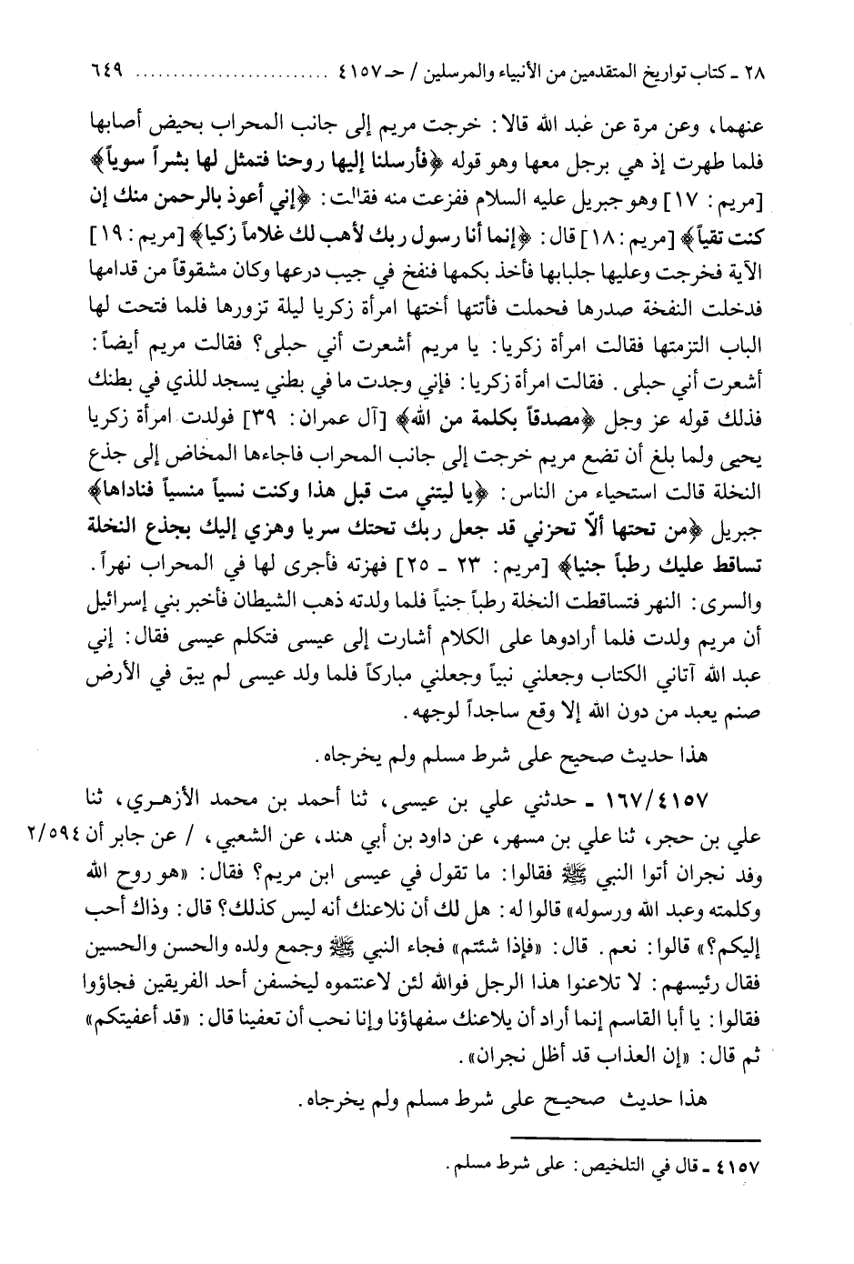 4157 - حَدَّثَنِي عَلِيُّ بْنُ عِيسَى، ثنا أَحْمَدُ بْنُ مُحَمَّدٍ الْأَزْهَرِيُّ، ثنا عَلِيُّ بْنُ حُجْرٍ، ثنا عَلِيُّ بْنُ مُسْهِرٍ، عَنْ دَاوُدَ بْنِ أَبِي هِنْدٍ، عَنِ الشَّعْبِيِّ، عَنْ جَابِرٍ أَنَّ §وَفْدَ نَجْرَانَ أَتَوُا النَّبِيَّ صَلَّى اللهُ عَلَيْهِ وَسَلَّمَ فَقَالُوا: مَا تَقُولُ فِي عِيسَى ابْنِ مَرْيَمَ؟ فَقَالَ: «هُوَ رُوحُ اللَّهِ وَكَلِمَتُهُ وَعَبْدُ اللَّهِ وَرَسُولُهُ» قَالُوا لَهُ: هَلْ لَكَ أَنْ نُلَاعِنَكَ أَنَّهُ لَيْسَ كَذَلِكَ؟ قَالَ: «وَذَاكَ أَحَبُّ إِلَيْكُمْ؟» قَالُوا: نَعَمْ. قَالَ: «فَإِذَا شِئْتُمْ» فَجَاءَ النَّبِيُّ صَلَّى اللهُ عَلَيْهِ وَسَلَّمَ وَجَمَعَ وَلَدَهُ وَالْحَسَنَ وَالْحُسَيْنَ فَقَالَ رَئِيسُهُمْ: لَا تُلَاعِنُوا هَذَا الرَّجُلَ فَوَاللَّهِ لَئِنْ لَاعَنْتُمُوهُ لَيُخْسَفَنَّ أَحَدُ الْفَرِيقَيْنِ. فَجَاءُوا فَقَالُوا: يَا أَبَا الْقَاسِمِ إِنَّمَا أَرَادَ أَنْ يُلَاعِنَكَ سُفَهَاؤُنَا وَإِنَّا نُحِبُّ أَنْ تُعْفِيَنَا قَالَ: «قَدْ أَعْفَيْتُكُمْ» ثُمَّ قَالَ: «إِنَّ الْعَذَابَ قَدْ أَظَلَّ نَجْرَانَ» هَذَا حَدِيثٌ صَحِيحٌ عَلَى شَرْطِ مُسْلِمٍ وَلَمْ يُخَرِّجَاهُ "K4157 - على شرط مسلم