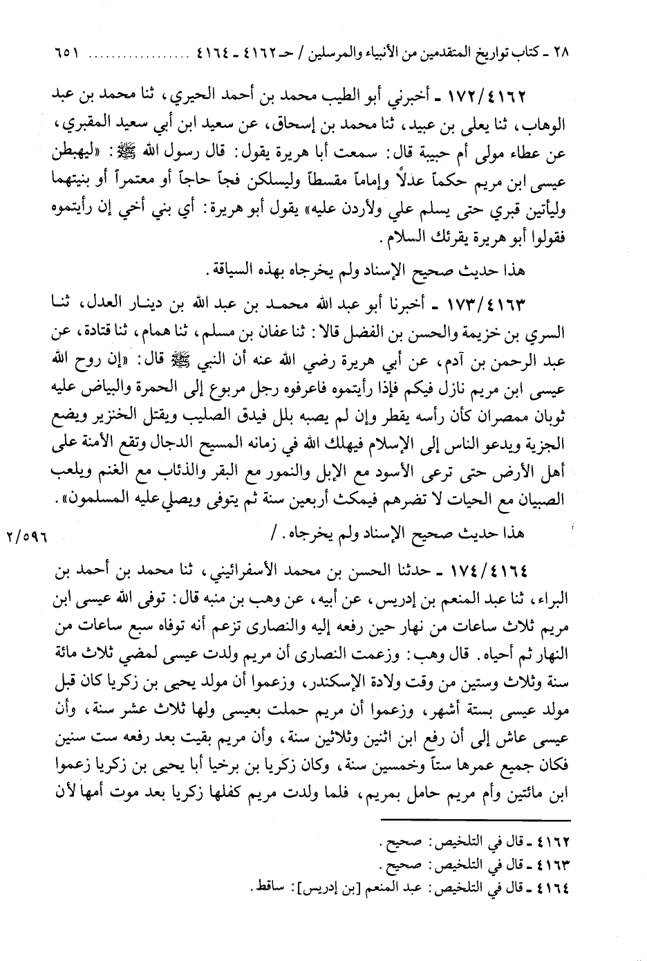 4164 - حَدَّثَنَا الْحَسَنُ بْنُ مُحَمَّدٍ الْإسْفَرَايِينِيُّ، ثنا مُحَمَّدُ بْنُ أَحْمَدَ بْنِ الْبَرَاءِ، ثنا عَبْدُ الْمُنْعِمِ بْنُ إِدْرِيسَ، عَنْ أَبِيهِ، عَنْ وَهْبِ بْنِ مُنَبِّهٍ، قَالَ: §«تَوَفَّى اللَّهُ عِيسَى ابْنَ مَرْيَمَ ثَلَاثَ سَاعَاتٍ مِنْ نَهَارٍ حِينَ رَفَعَهُ إِلَيْهِ وَالنَّصَارَى تَزْعُمُ أَنَّهُ تَوَفَّاهُ سَبْعَ سَاعَاتٍ مِنَ النَّهَارِ، ثُمَّ أَحْيَاهُ» قَالَ وَهْبٌ: «وَزَعَمَتِ النَّصَارَى أَنَّ مَرْيَمَ وَلَدَتْ عِيسَى لِمُضِيِّ ثَلَاثِ مِائَةِ سَنَةٍ وَثَلَاثٍ وَسِتِّينَ مِنْ وَقْتِ وِلَادَةِ الْإِسْكَنْدَرِ وَزَعَمُوا أَنَّ مَوْلِدَ يَحْيَى بْنِ زَكَرِيَّا كَانَ قَبْلَ مَوْلِدِ عِيسَى بِسِتَّةِ أَشْهُرٍ، وَزَعَمُوا أَنَّ مَرْيَمَ حَمَلَتْ بِعِيسَى وَلَهَا ثَلَاثَ عَشْرَةَ سَنَةً، وَأَنَّ عِيسَى عَاشَ إِلَى أَنْ رُفِعَ ابْنَ اثْنَيْنِ وَثَلَاثِينَ سَنَةً، وَأَنَّ مَرْيَمَ بَقِيَتْ بَعْدَ رَفْعِهِ سِتَّ سِنِينَ فَكَانَ جَمِيعُ عُمْرِهَا سِتًّا وَخَمْسِينَ سَنَةً، وَكَانَ زَكَرِيَا بْنُ بَرْخِيَا أَبَا يَحْيَى بْنِ زَكَرِيَّا زَعَمُوا ابْنَ مِائَتَيْنِ، وَأُمُّ مَرْيَمَ حَامِلٌ بِمَرْيَمَ فَلَمَّا وُلِدَتْ مَرْيَمَ كَفَلَهَا زَكَرِيَّا بَعْدَ مَوْتِ أُمِّهَا لِأَنَّ خَالَتَهَا أُخْتُ أُمِّهَا كَانَتْ عِنْدَهُ وَاسْمُ أُمِّ مَرْيَمَ حَنَّةُ بِنْتُ فَاقُوذَ بْنِ قِيلَ» قَالَ الْحَاكِمُ: «قَدِ اخْتَلَفَتِ الرِّوَايَاتُ فِي عَدَدِ الْمُرْسَلِينَ مِنَ الْأَنْبِيَاءِ وَسَائِرِ الْأَنْبِيَاءِ وَالَّذِي أَدَّى إِلَيْهِ الِاجْتِهَادُ مِنْ لَدُنْ آدَمَ إِلَى أَنْ بُعِثَ نَبِيُّنَا الْمُصْطَفَى صَلَّى اللهُ عَلَيْهِ وَسَلَّمَ فَقَدْ ذَكَرْتُهُمْ» K4164 - عبد المنعم بن إدريس ساقط