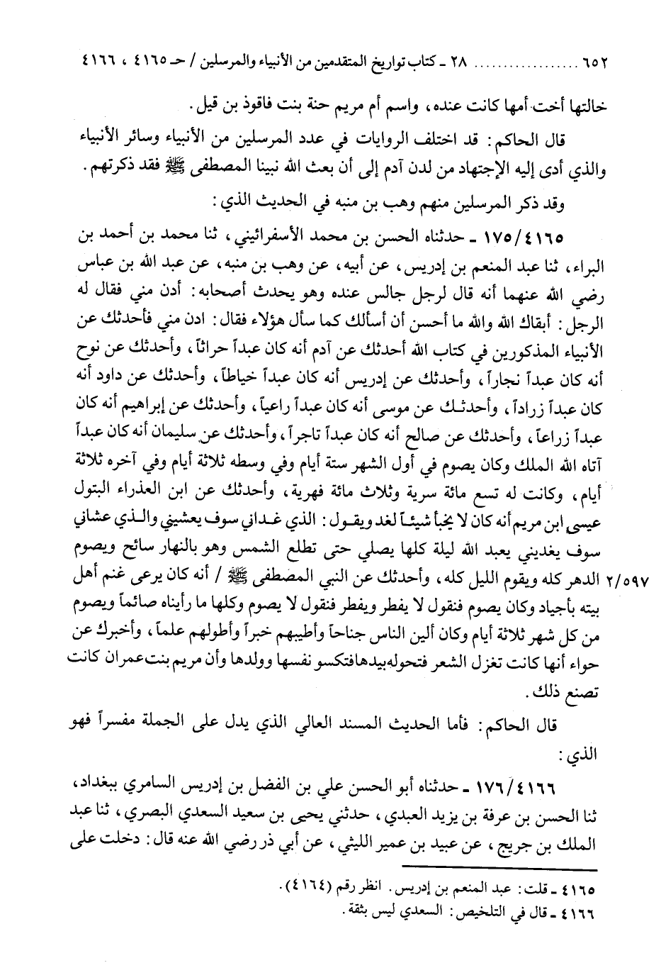 4165 - حَدَّثَنَاهُ الْحَسَنُ بْنُ مُحَمَّدٍ الْإسْفَرَايِينِيُّ، ثنا مُحَمَّدُ بْنُ أَحْمَدَ بْنِ الْبَرَاءِ، ثنا عَبْدُ الْمُنْعِمِ بْنُ إِدْرِيسَ، عَنْ أَبِيهِ، عَنْ وَهْبِ بْنِ مُنَبِّهٍ، عَنْ عَبْدِ اللَّهِ بْنِ عَبَّاسٍ رَضِيَ اللَّهُ عَنْهُمَا، أَنَّهُ قَالَ لِرَجُلٍ جَالِسٍ عِنْدَهُ وَهُوَ يُحَدِّثُ أَصْحَابَهُ: ادْنُ مِنِّي فَقَالَ لَهُ الرَّجُلُ: أَبْقَاكَ اللَّهُ، وَاللَّهِ مَا أُحْسِنُ أَنْ أَسْأَلَكَ كَمَا سَأَلَ هَؤُلَاءِ، فَقَالَ: ادْنُ مِنِّي فَأُحَدِّثُكَ عَنِ الْأَنْبِيَاءِ الْمَذْكُورِينَ فِي كِتَابِ اللَّهِ أُحَدِّثُكَ عَنْ آدَمَ إِنَّهُ كَانَ عَبْدًا حَرَّاثًا، وَأُحَدِّثُكَ عَنْ نُوحٍ إِنَّهُ كَانَ عَبْدًا نَجَّارًا، وَأُحَدِّثُكَ عَنْ إِدْرِيسَ إِنَّهُ كَانَ عَبْدًا خَيَّاطًا، وَأُحَدِّثُكَ عَنْ دَاوُدَ أَنَّهُ كَانَ عَبْدًا زَرَّادًا، وَأُحَدِّثُكَ عَنْ مُوسَى أَنَّهُ كَانَ عَبْدًا رَاعِيًا، وَأُحَدِّثُكَ عَنْ إِبْرَاهِيمَ أَنَّهُ كَانَ عَبْدًا زَرَّاعًا، وَأُحَدِّثُكَ عَنْ صَالِحٍ أَنَّهُ كَانَ عَبْدًا تَاجِرًا، وَأُحَدِّثُكَ عَنْ سُلَيْمَانَ أَنَّهُ كَانَ عَبْدًا آتَاهُ اللَّهُ الْمُلْكَ وَكَانَ يَصُومُ فِي أَوَّلِ الشَّهْرِ سِتَّةَ أَيَّامٍ وَفِي وَسَطِهِ ثَلَاثَةَ أَيَّامٍ وَفِي آخِرِهِ ثَلَاثَةَ أَيَّامٍ وَكَانَتْ لَهُ تِسْعُ مِائَةِ سَرِيَّةٍ، وَثَلَاثُ مِائَةِ فِهْرِيَّةٍ وَأُحَدِّثُكَ عَنِ ابْنِ الْعَذْرَاءِ الْبَتُولِ عِيسَى ابْنِ مَرْيَمَ أَنَّهُ كَانَ لَا يَخْبَأُ شَيْئًا لِغَدٍ وَيَقُولُ: الَّذِي غَدَّانِي سَوْفَ يُعَشِّينِي وَالَّذِي عَشَّانِي سَوْفَ يُغَدِّينِي، يَعْبُدُ اللَّهَ لَيْلَةً كُلَّهَا يُصَلِّي حَتَّى تَطْلُعَ الشَّمْسُ وَهُوَ بِالنَّهَارِ سَائِحٌ، وَيَصُومُ الدَّهْرَ كُلَّهُ، وَيَقُومُ اللَّيْلَ كُلَّهُ، " وَأُحَدِّثُكَ عَنِ النَّبِيِّ الْمُصْطَفَى صَلَّى اللهُ عَلَيْهِ وَسَلَّمَ أَنَّهُ §كَانَ يَرْعَى غَنْمَ أَهْلِ بَيْتِهِ بِأَجْيَادَ، وَكَانَ يَصُومُ فَنَقُولُ: لَا يُفْطِرُ، وَيُفْطِرُ فَنَقُولُ: لَا يَصُومُ، وَكُلُّهَا مَا رَأَيْنَاهُ صَائِمًا وَيَصُومُ مِنْ كُلِّ شَهْرٍ ثَلَاثَةَ أَيَّامٍ، وَكَانَ أَلْيَنَ النَّاسِ جَنَاحًا وَأَطْيَبَهُمْ خَبَرًا، وَأَطْوَلَهُمْ عِلْمًا "، وَأُخْبِرُكَ عَنْ حَوَّاءَ أَنَّهَا كَانَتْ تَغْزِلُ الشَّعْرَ فَتُحَوِّلُهُ بِيَدِهَا فَتَكْسُو نَفْسَهَا وَوَلَدَهَا، وَأَنَّ مَرْيَمَ بِنْتَ عِمْرَانَ كَانَتْ تَصْنَعُ ذَلِكَ قَالَ الْحَاكِمُ: «فَأَمَّا الْحَدِيثُ الْمُسْنَدُ الْعَالِي الَّذِي يَدُلُّ عَلَى الْجُمْلَةِ مُفَسَّرًا فَهُوَ الَّذِي»