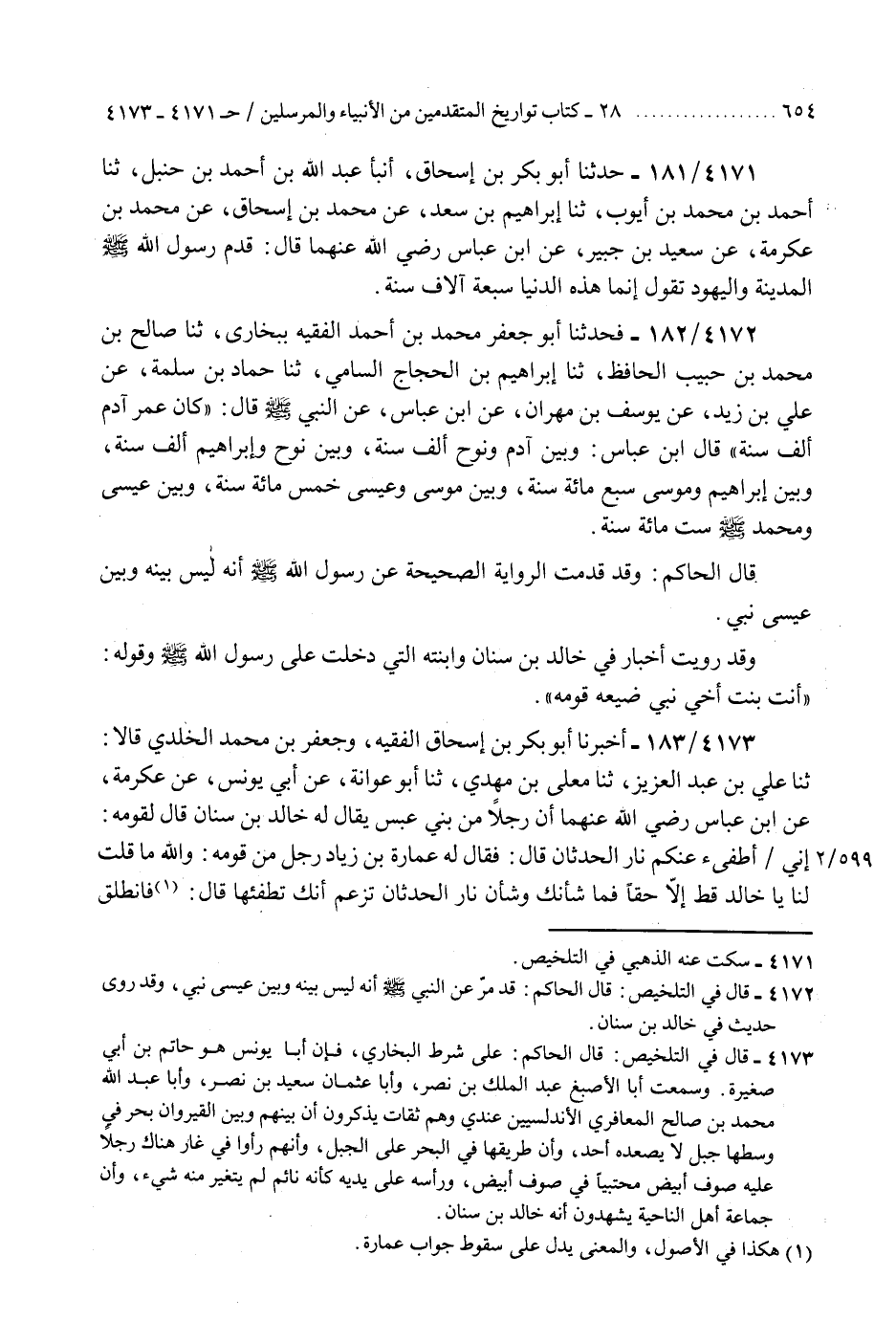 4172 - فَحَدَّثَنَا أَبُو جَعْفَرٍ مُحَمَّدُ بْنُ أَحْمَدَ الْفَقِيهُ بِبُخَارَى، ثنا صَالِحُ بْنُ مُحَمَّدِ بْنِ حَبِيبٍ الْحَافِظُ، ثنا إِبْرَاهِيمُ بْنُ الْحَجَّاجِ السَّامِيُّ، ثنا حَمَّادُ بْنُ سَلَمَةَ، عَنْ عَلِيِّ بْنِ زَيْدٍ، عَنْ يُوسُفَ بْنِ مِهْرَانَ، عَنِ ابْنِ عَبَّاسٍ، عَنِ النَّبِيِّ صَلَّى اللهُ عَلَيْهِ وَسَلَّمَ قَالَ: «كَانَ §عُمْرُ آدَمَ أَلْفَ سَنَةٍ» قَالَ ابْنُ عَبَّاسٍ: «وَبَيْنَ آدَمَ وَنُوحٍ أَلْفُ سَنَةٍ، وَبَيْنَ نُوحٍ وَإِبْرَاهِيمَ أَلْفُ سَنَةٍ، وَبَيْنَ إِبْرَاهِيمَ وَمُوسَى سَبْعُ مِائَةِ سَنَةٍ، وَبَيْنَ مُوسَى وَعِيسَى خَمْسُ مِائَةِ سَنَةٍ، وَبَيْنَ عِيسَى وَمُحَمَّدٍ صَلَّى اللهُ عَلَيْهِ وَسَلَّمَ سِتُّ مِائَةِ سَنَةٍ» قَالَ الْحَاكِمُ: «وَقَدْ قَدَّمْتُ الرِّوَايَةَ الصَّحِيحَةَ عَنْ رَسُولِ اللَّهِ صَلَّى اللهُ عَلَيْهِ وَسَلَّمَ أَنَّهُ لَيْسَ بَيْنَهُ وَبَيْنَ عِيسَى نَبِيٌّ» وَقَدْ رُوِّيتُ أَخْبَارًا فِي خَالِدِ بْنِ سِنَانٍ وَابْنَتِهِ الَّتِي دَخَلَتْ عَلَى رَسُولِ اللَّهِ صَلَّى اللهُ عَلَيْهِ وَسَلَّمَ وَقَوْلِهِ: «أَنْتِ بِنْتُ أَخِي نَبِيٍّ ضَيَّعَهُ قَوْمُهُ»