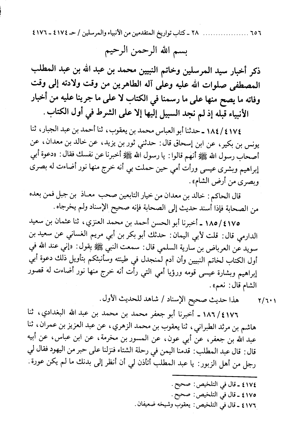 4174 - حَدَّثَنَا أَبُو الْعَبَّاسِ مُحَمَّدُ بْنُ يَعْقُوبَ، ثنا أَحْمَدُ بْنُ عَبْدِ الْجَبَّارِ، ثنا يُونُسُ بْنُ بُكَيْرٍ، عَنِ ابْنِ إِسْحَاقَ، قَالَ: حَدَّثَنِي ثَوْرُ بْنُ يَزِيدَ، عَنْ خَالِدِ بْنِ مَعْدَانَ، عَنْ أَصْحَابِ رَسُولِ اللَّهِ صَلَّى اللهُ عَلَيْهِ وَسَلَّمَ، أَنَّهُمْ قَالُوا: يَا رَسُولَ اللَّهِ، أَخْبِرْنَا عَنْ نَفْسِكَ، فَقَالَ: «§دَعْوَةُ أَبِي إِبْرَاهِيمَ، وَبُشْرَى عِيسَى، وَرَأَتْ أُمِّي حِينَ حَمَلَتْ بِي أَنَّهُ خَرَجَ مِنْهَا نُورٌ أَضَاءَتْ لَهُ بُصْرَى وَبُصْرَى مِنْ أَرْضِ الشَّامِ» قَالَ الْحَاكِمُ: «خَالِدُ بْنُ مَعْدَانَ مِنْ خِيَارِ التَّابِعِينَ، صَحِبَ مُعَاذَ بْنَ جَبَلٍ فَمَنْ بَعْدَهُ مِنَ الصَّحَابَةِ فَإِذَا أَسْنَدَ حَدِيثًا إِلَى الصَّحَابَةِ فَإِنَّهُ صَحِيحُ الْإِسْنَادِ وَلَمْ يُخَرِّجَاهُ» K4174 - صحيح