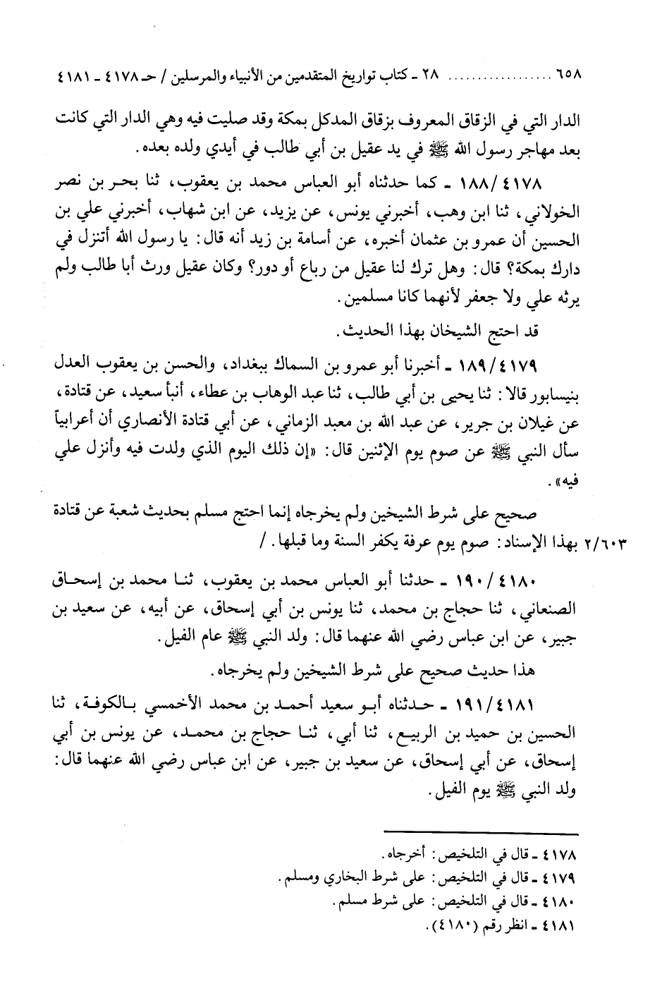 4180 - حَدَّثَنَا أَبُو الْعَبَّاسِ مُحَمَّدُ بْنُ يَعْقُوبَ، ثنا مُحَمَّدُ بْنُ إِسْحَاقَ الصَّغَانِيُّ، ثنا حَجَّاجُ بْنُ مُحَمَّدٍ، ثنا يُونُسُ بْنُ أَبِي إِسْحَاقَ، عَنْ أَبِيهِ، عَنْ سَعِيدِ بْنِ جُبَيْرٍ، عَنِ ابْنِ عَبَّاسٍ رَضِيَ اللَّهُ عَنْهُمَا، قَالَ: §«وُلِدَ النَّبِيُّ صَلَّى اللهُ عَلَيْهِ وَسَلَّمَ عَامَ الْفِيلِ» هَذَا حَدِيثٌ صَحِيحٌ عَلَى شَرْطِ الشَّيْخَيْنِ وَلَمْ يُخَرِّجَاهُ "K4180 - على شرط مسلم
