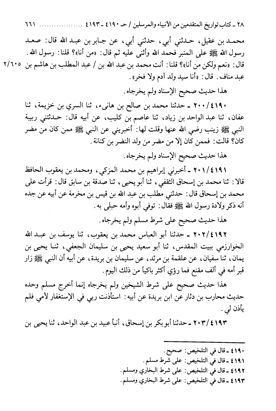4191 - أَخْبَرَنِي إِبْرَاهِيمُ بْنُ مُحَمَّدٍ الْمُزَكِّي، وَمُحَمَّدُ بْنُ يَعْقُوبَ الْحَافِظُ، قَالَا: ثنا مُحَمَّدُ بْنُ إِسْحَاقَ الثَّقَفِيُّ، ثنا أَبُو يَحْيَى، ثنا صَدَقَةُ بْنُ سَابِقٍ، قَالَ: قَرَأْتُ عَلَى مُحَمَّدِ بْنِ إِسْحَاقَ، قَالَ: حَدَّثَنِي مُطَّلِبُ بْنُ عَبْدِ اللَّهِ بْنِ قَيْسِ بْنِ مَخْرَمَةَ، عَنْ أَبِيهِ، عَنْ جَدِّهِ، أَنَّهُ ذَكَرَ وِلَادَةَ رَسُولِ اللَّهِ صَلَّى اللهُ عَلَيْهِ وَسَلَّمَ فَقَالَ: §«تُوُفِّيَ أَبُوهُ وَأُمُّهُ حُبْلَى بِهِ» هَذَا حَدِيثٌ صَحِيحٌ عَلَى شَرْطِ مُسْلِمٍ وَلَمْ يُخَرِّجَاهُ "K4191 - على شرط مسلم