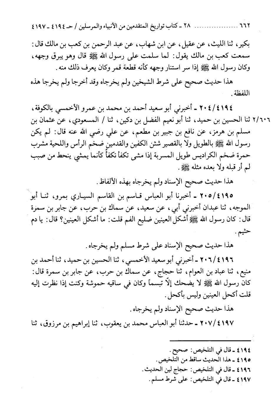 4194 - أَخْبَرَنِي أَبُو سَعِيدٍ أَحْمَدُ بْنُ مُحَمَّدِ بْنِ عَمْرٍو الْأَحْمَسِيُّ بِالْكُوفَةِ، ثنا الْحُسَيْنُ بْنُ حُمَيْدٍ، ثنا أَبُو نُعَيْمٍ الْفَضْلُ بْنُ دُكَيْنٍ، ثنا الْمَسْعُودِيُّ، عَنْ عُثْمَانَ بْنِ مُسْلِمِ بْنِ هُرْمُزَ، عَنْ نَافِعِ بْنِ جُبَيْرٍ بْنِ مُطْعِمٍ، عَنْ عَلِيٍّ رَضِيَ اللَّهُ عَنْهُ، قَالَ: «§لَمْ يَكُنْ رَسُولُ اللَّهِ صَلَّى اللهُ عَلَيْهِ وَسَلَّمَ بِالطَّوِيلِ، وَلَا بِالْقَصِيرِ شَثْنُ الْكَفَّيْنِ، وَالْقَدَمَيْنِ ضَخْمُ الرَّأْسِ وَاللِّحْيَةِ، مُشْرَبٌ حُمْرَةً ضَخْمُ الْكَرَادِيسِ طَوِيلُ الْمَسْرُبَةِ إِذَا مَشَى تَكَفَّأَ تَكَفُّؤًا كَأَنَّمَا يَمْشِي يَنْحَطُّ مِنْ صَبَبٍ، لَمْ أَرْ قَبْلَهُ وَلَا بَعْدَهُ مِثْلَهُ صَلَّى اللهُ عَلَيْهِ وَسَلَّمَ» هَذَا حَدِيثٌ صَحِيحُ الْإِسْنَادِ وَلَمْ يُخَرِّجَاهُ بِهَذِهِ الْأَلْفَاظِ "K4194 - صحيح
