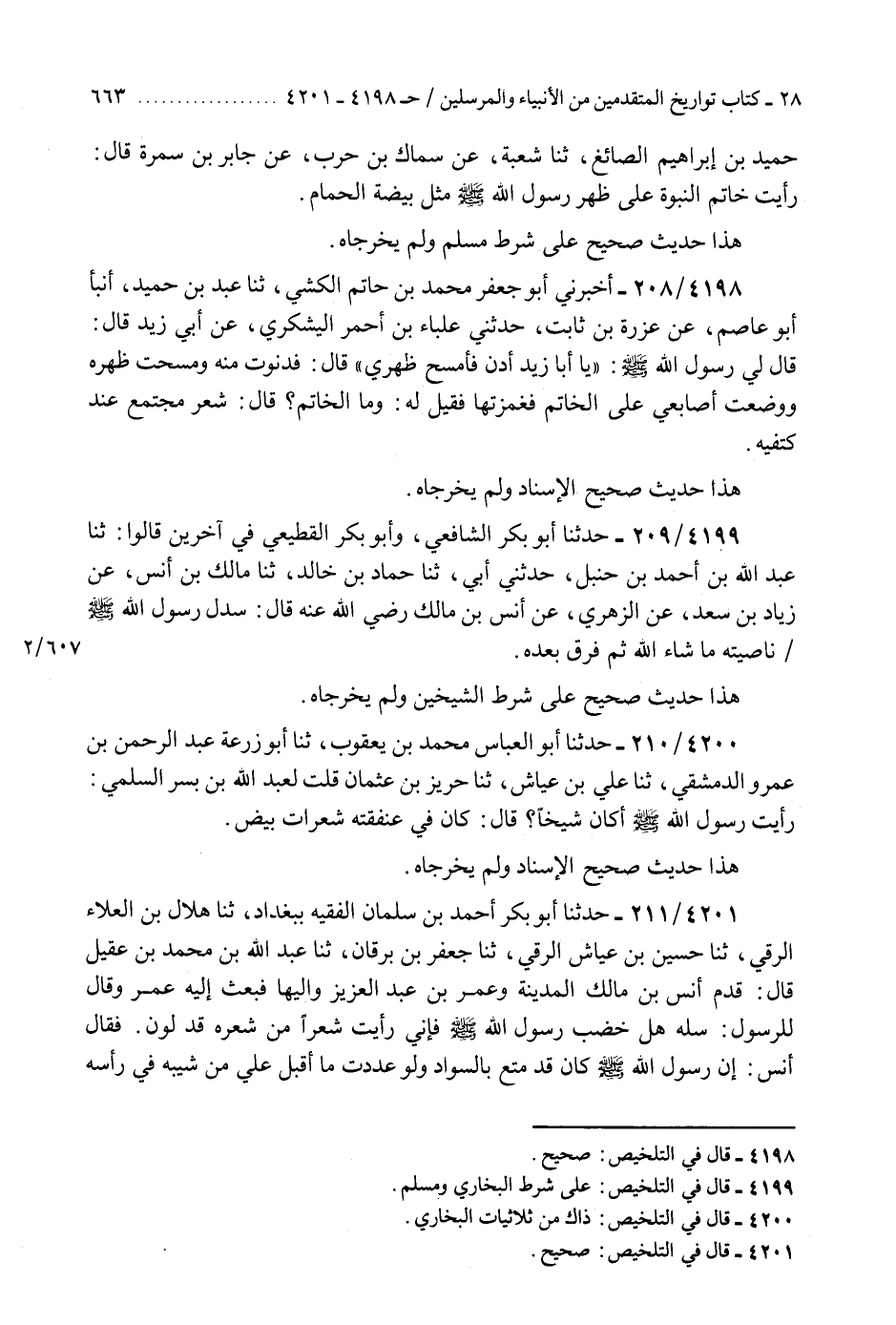 4201 - حَدَّثَنَا أَبُو بَكْرٍ أَحْمَدُ بْنُ سَلْمَانَ الْفَقِيهُ بِبَغْدَادَ، ثنا هِلَالُ بْنُ الْعَلَاءِ الرَّقِّيُّ، ثنا حُسَيْنُ بْنُ عَيَّاشٍ الرَّقِّيُّ، ثنا جَعْفَرُ بْنُ بُرْقَانَ، ثنا عَبْدُ اللَّهِ بْنُ مُحَمَّدِ بْنِ عَقِيلٍ، قَالَ: قَدِمَ أَنَسُ بْنُ مَالِكٍ الْمَدِينَةَ وَعُمَرُ بْنُ عَبْدِ الْعَزِيزِ وَالِيهَا فَبَعَثَ إِلَيْهِ عُمَرُ وَقَالَ لِلرَّسُولِ: سَلْهُ هَلْ خَضَبَ رَسُولُ اللَّهِ صَلَّى اللهُ عَلَيْهِ وَسَلَّمَ؟ فَإِنِّي رَأَيْتُ شَعْرًا مِنْ شَعْرِهِ قَدْ لُوِّنَ، فَقَالَ أَنَسٌ: «إِنَّ رَسُولَ اللَّهِ صَلَّى اللهُ عَلَيْهِ وَسَلَّمَ كَانَ §قَدْ مُتِّعَ بِالسَّوَادِ وَلَوْ عَدَدْتُ مَا أَقْبَلَ عَلَيَّ مِنْ شَيْبِهِ فِي رَأْسِهِ وَلِحْيَتِهِ، مَا كُنْتُ أَزِيدُهُنَّ عَلَى إِحْدَى عَشْرَةَ شَيْبَةً، وَإِنَّمَا هَذَا الَّذِي لُوِّنَ مِنَ الطِّيبِ الَّذِي كَانَ يُطَيِّبُ شَعْرَ رَسُولِ اللَّهِ صَلَّى اللهُ عَلَيْهِ وَسَلَّمَ» هَذَا حَدِيثٌ صَحِيحُ الْإِسْنَادِ وَلَمْ يُخَرِّجَاهُ "K4201 - صحيح