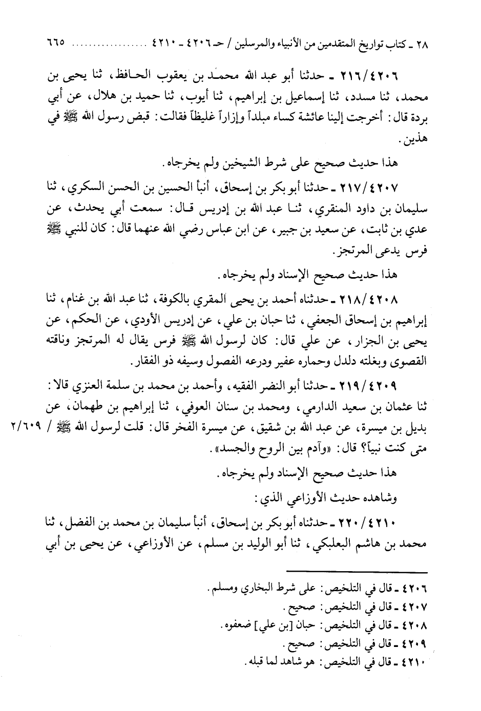 4206 - حَدَّثَنَا أَبُو عَبْدِ اللَّهِ مُحَمَّدُ بْنُ يَعْقُوبَ الْحَافِظُ، ثنا يَحْيَى بْنُ مُحَمَّدٍ، ثنا مُسَدَّدٌ، ثنا إِسْمَاعِيلُ بْنُ إِبْرَاهِيمَ، ثنا أَيُّوبُ، ثنا حُمَيْدُ بْنُ هِلَالٍ، عَنْ أَبِي بُرْدَةَ، قَالَ: أَخْرَجَتْ إِلَيْنَا عَائِشَةُ كِسَاءً مُبَلَّدًا وَإِزَارًا غَلِيظًا فَقَالَتْ: §«قُبِضَ رَسُولُ اللَّهِ صَلَّى اللهُ عَلَيْهِ وَسَلَّمَ فِي هَذَيْنِ» هَذَا حَدِيثٌ صَحِيحٌ عَلَى شَرْطِ الشَّيْخَيْنِ وَلَمْ يُخَرِّجَاهُ "K4206 - على شرط البخاري ومسلم