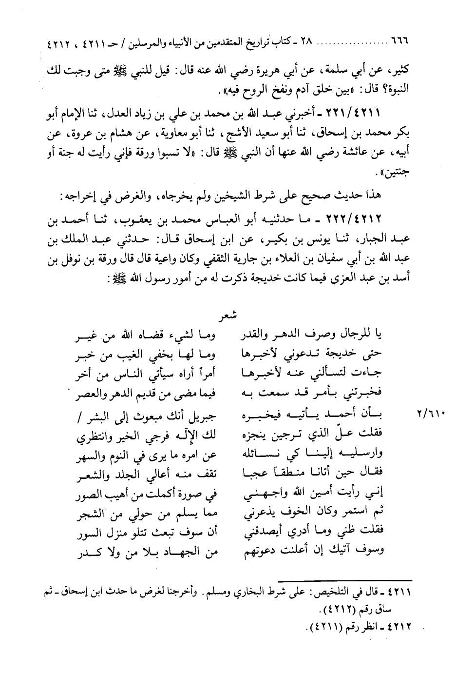 4211 - أَخْبَرَنِي عَبْدُ اللَّهِ بْنُ مُحَمَّدِ بْنِ عَلِيِّ بْنِ زِيَادٍ الْعَدْلُ، ثنا الْإِمَامُ أَبُو بَكْرٍ مُحَمَّدُ بْنُ إِسْحَاقَ، ثنا أَبُو سَعِيدٍ الْأَشَجُّ، ثنا أَبُو مُعَاوِيَةَ، عَنْ هِشَامِ بْنِ عُرْوَةَ، عَنْ أَبِيهِ، عَنْ عَائِشَةَ رَضِيَ اللَّهُ عَنْهَا، أَنَّ النَّبِيَّ صَلَّى اللهُ عَلَيْهِ وَسَلَّمَ قَالَ: §«لَا تَسُبُّوا وَرَقَةَ فَإِنِّي رَأَيْتُ لَهُ جَنَّةً أَوْ جَنَّتَيْنِ» هَذَا حَدِيثٌ صَحِيحٌ عَلَى شَرْطِ الشَّيْخَيْنِ وَلَمْ يُخَرِّجَاهُ، وَالْغَرَضُ فِي إِخْرَاجِهِ "K4211 - على شرط البخاري ومسلم