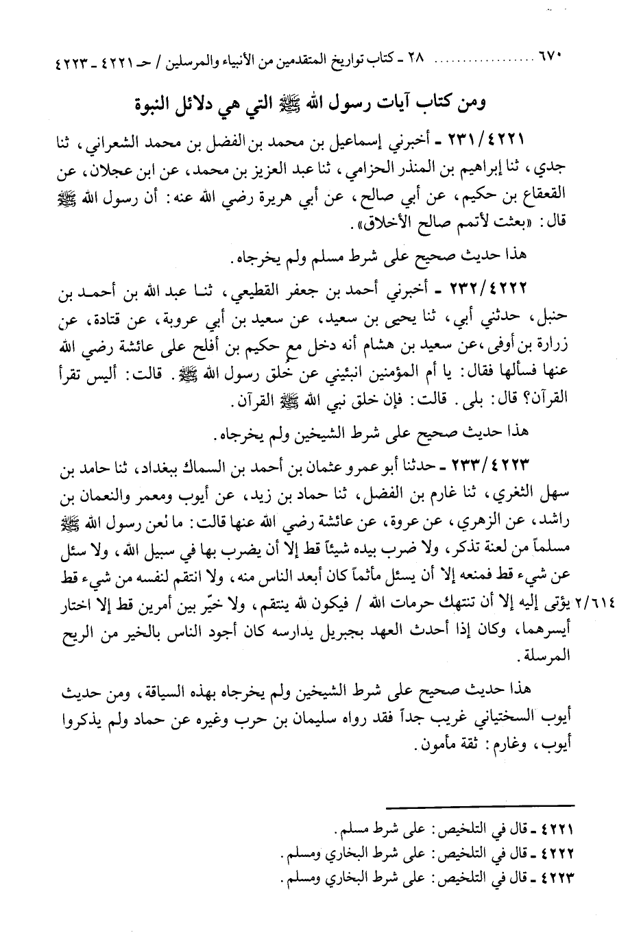 4222 - أَخْبَرَنِي أَحْمَدُ بْنُ جَعْفَرٍ الْقَطِيعِي، ثنا عَبْدُ اللَّهِ بْنُ أَحْمَدَ بْنِ حَنْبَلٍ، حَدَّثَنِي أَبِي، ثنا يَحْيَى بْنُ سَعِيدٍ، عَنْ سَعِيدِ بْنِ أَبِي عَرُوبَةَ، عَنْ قَتَادَةَ، عَنْ زُرَارَةَ بْنِ أَوْفَى، عَنْ سَعِيدِ بْنِ هِشَامٍ، أَنَّهُ دَخَلَ مَعَ حَكِيمِ بْنِ أَفْلَحَ عَلَى عَائِشَةَ رَضِيَ اللَّهُ عَنْهَا فَسَأَلَهَا فَقَالَ: يَا أُمَّ الْمُؤْمِنِينَ، أَنْبِئِينِي عَنْ خُلُقِ رَسُولِ اللَّهِ صَلَّى اللهُ عَلَيْهِ وَسَلَّمَ. قَالَتْ: " §أَلَيْسَ تَقْرَأُ الْقُرْآنَ؟ قَالَ: بَلَى، قَالَتْ: فَإِنَّ خُلُقَ نَبِيِّ اللَّهِ صَلَّى اللهُ عَلَيْهِ وَسَلَّمَ الْقُرْآنُ «هَذَا حَدِيثٌ صَحِيحٌ عَلَى شَرْطِ الشَّيْخَيْنِ وَلَمْ يُخَرِّجَاهُ» K4222 - على شرط البخاري ومسلم